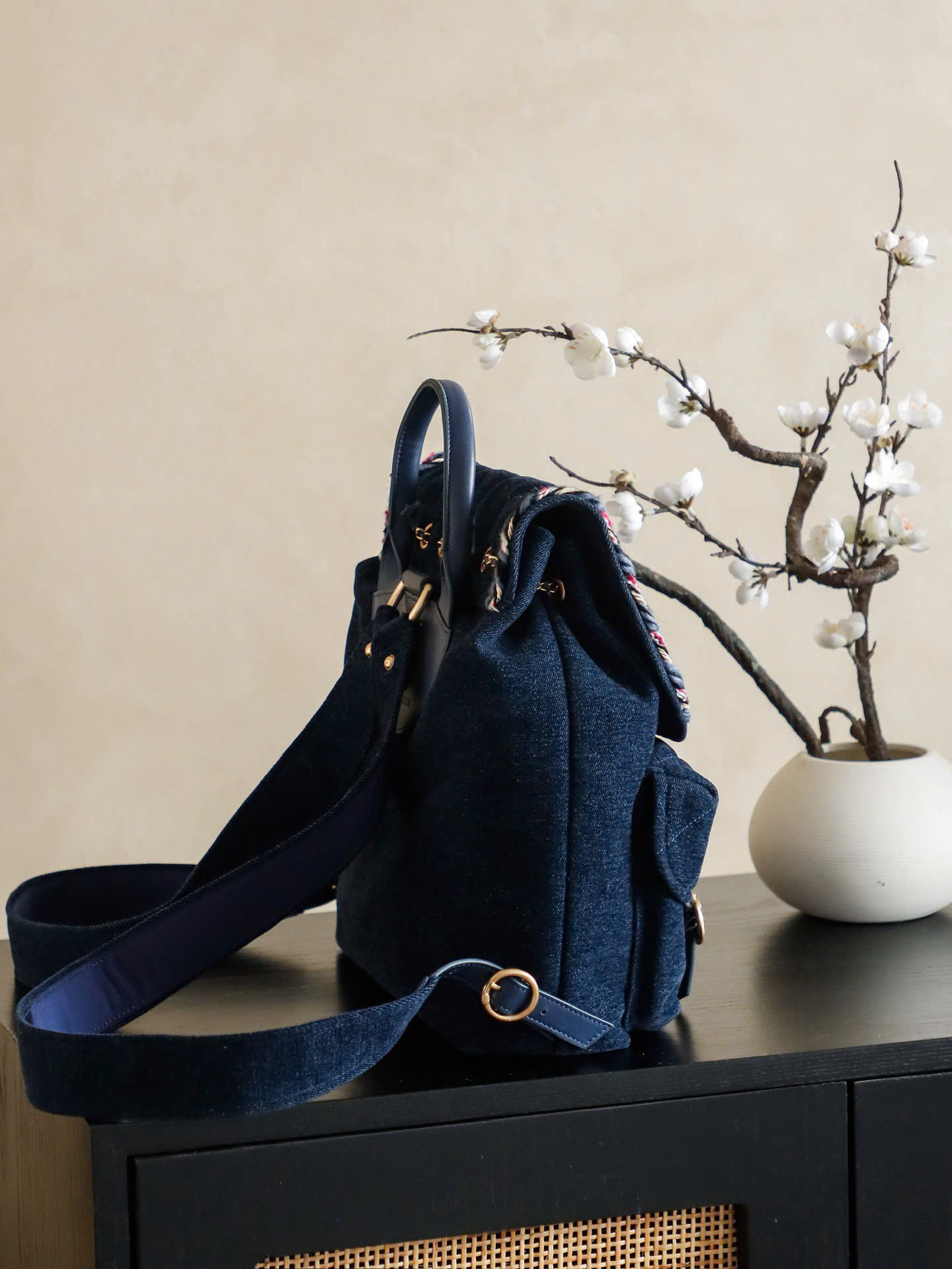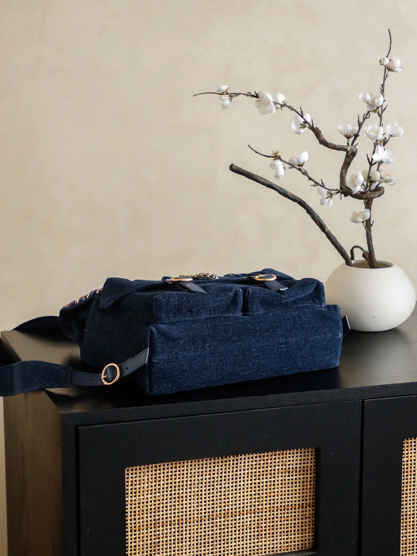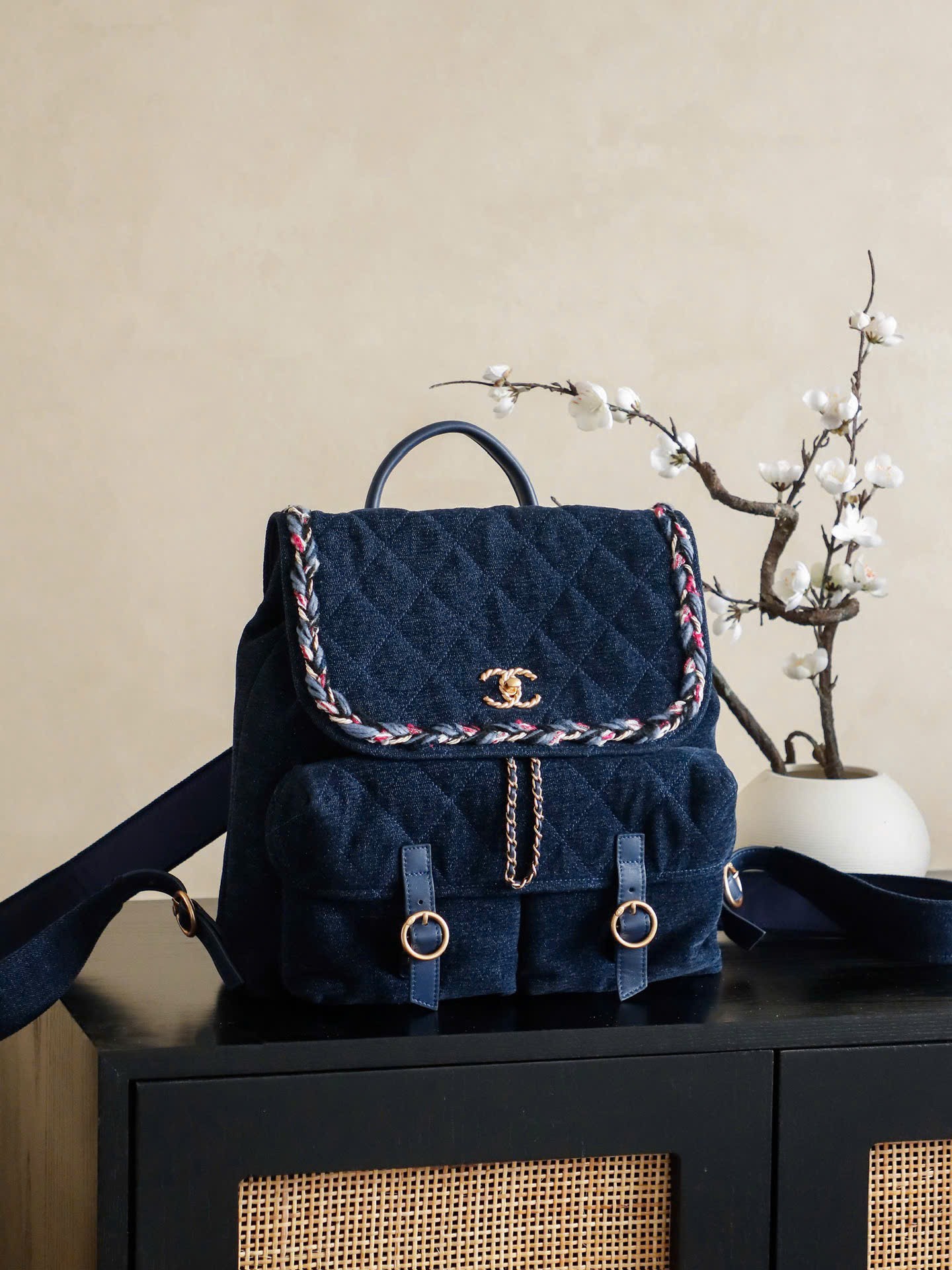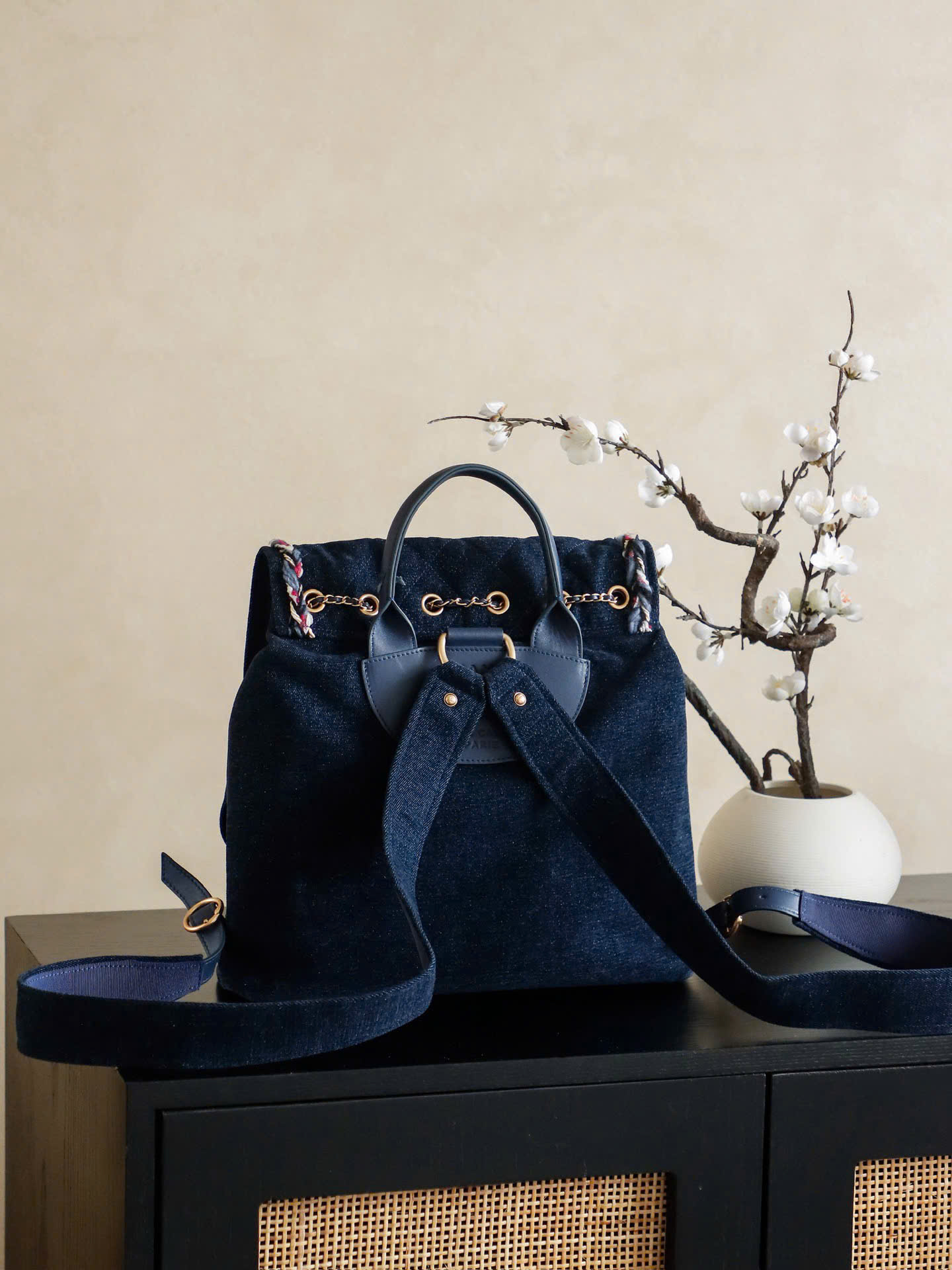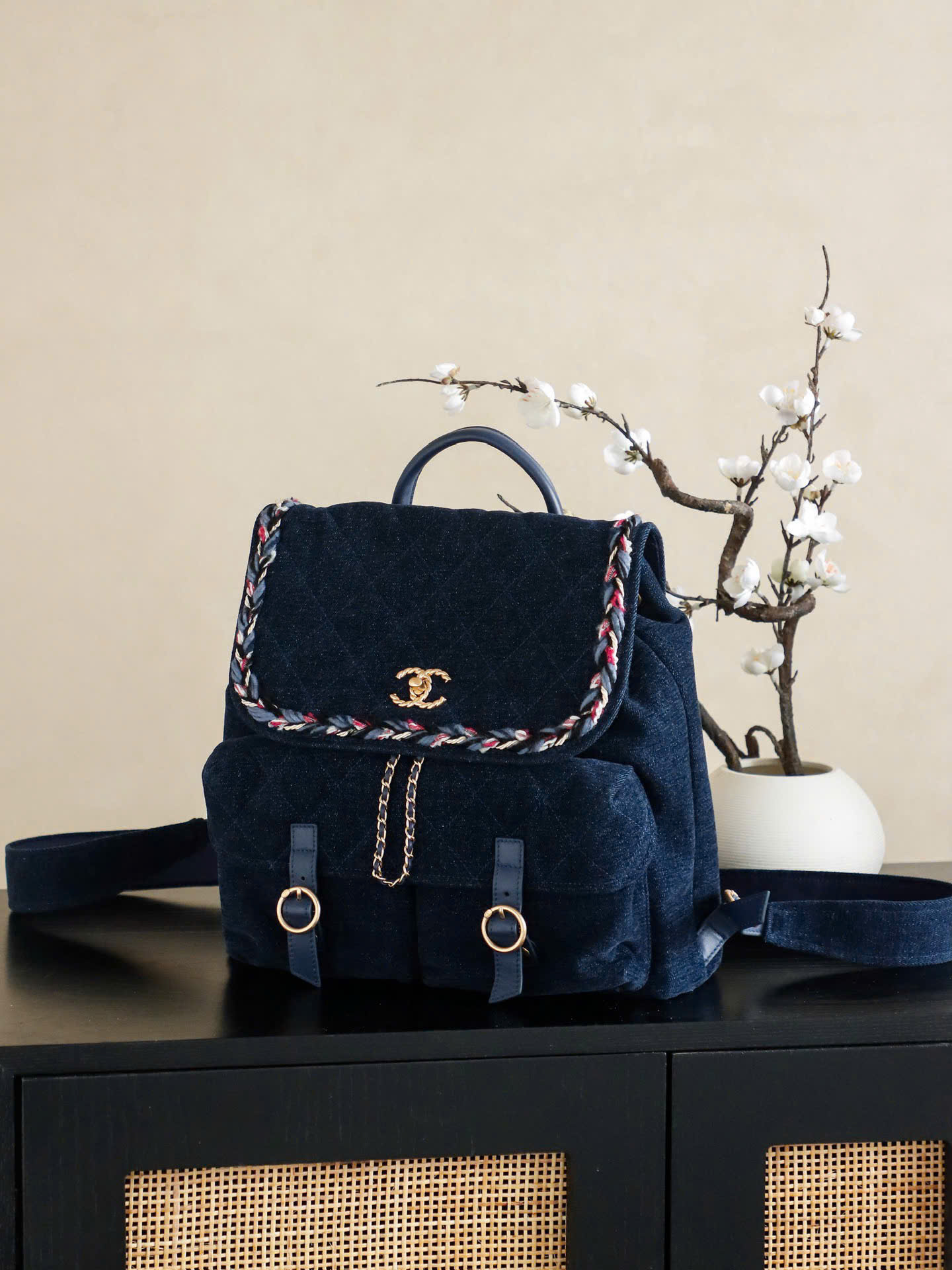 • Thiết kế dây rút + nắp túi, kèm khóa Double C tinh tế phía trước.