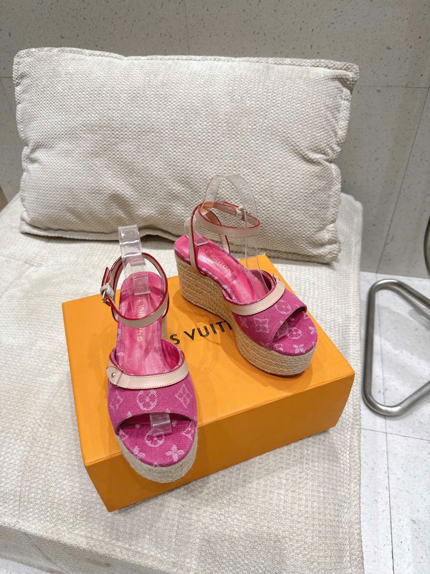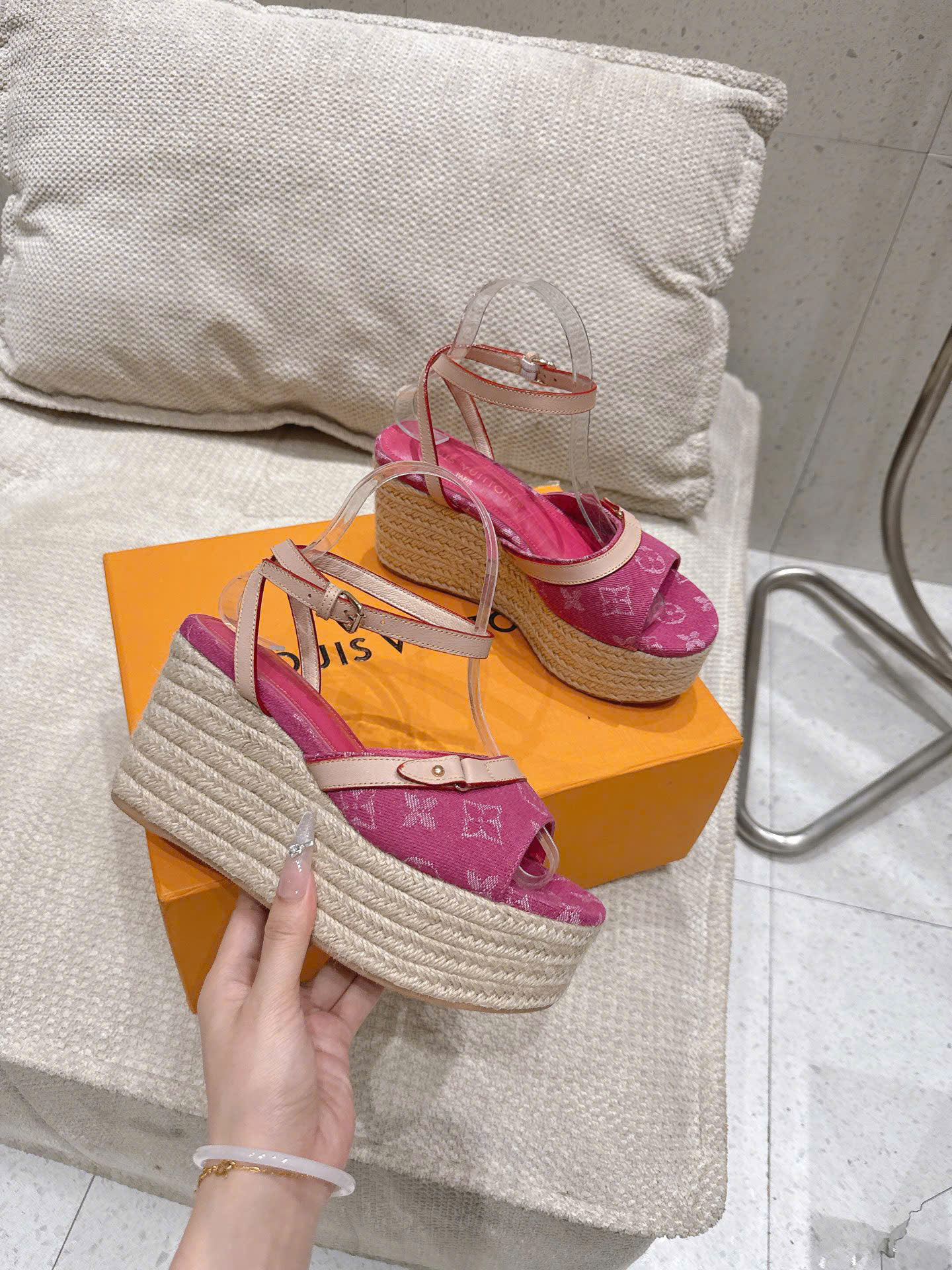 Sandal LV Helios Wedge Denim Monogram – Siêu cấp - hồng