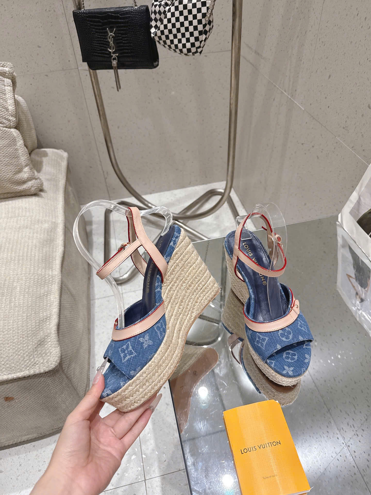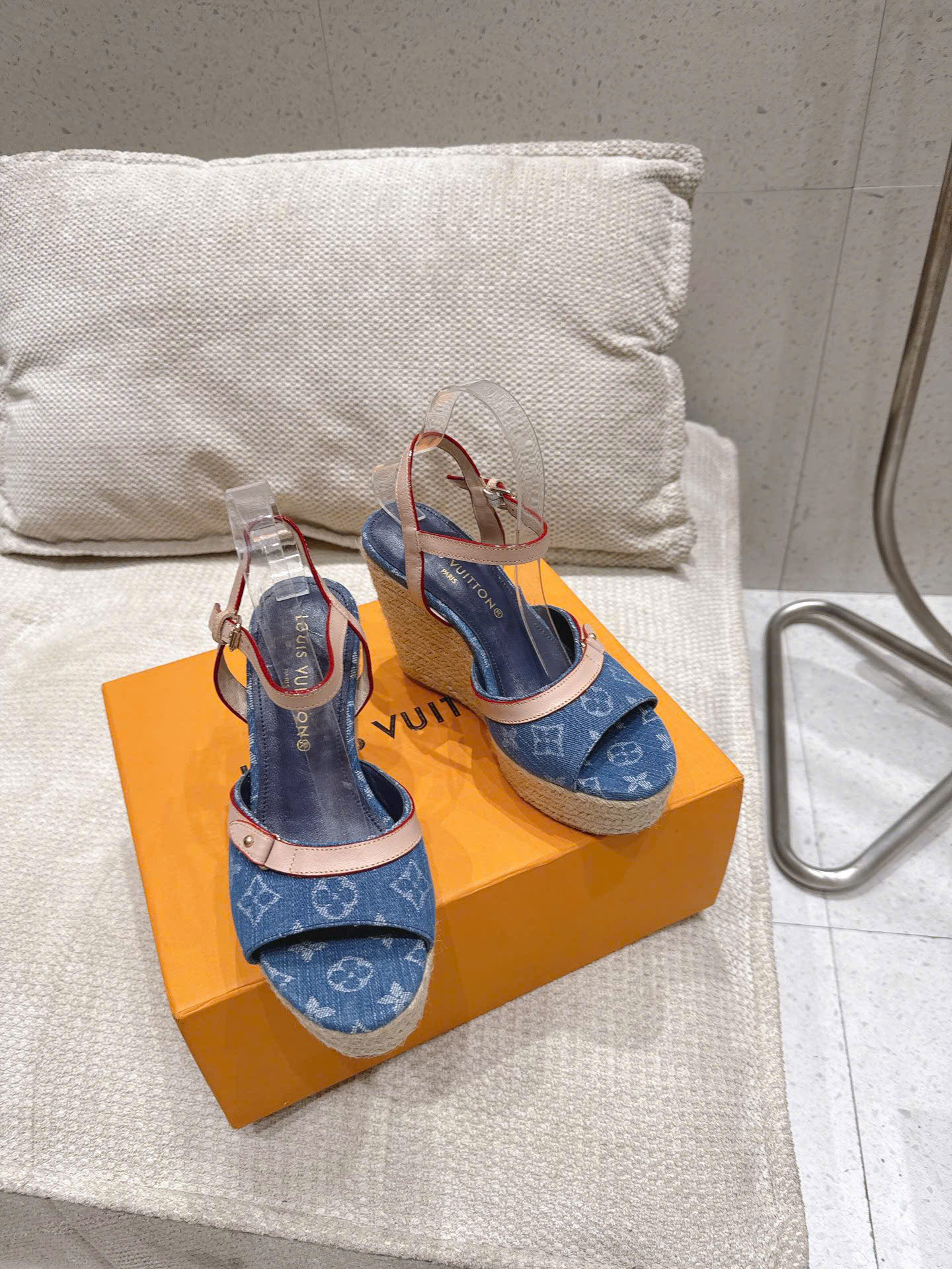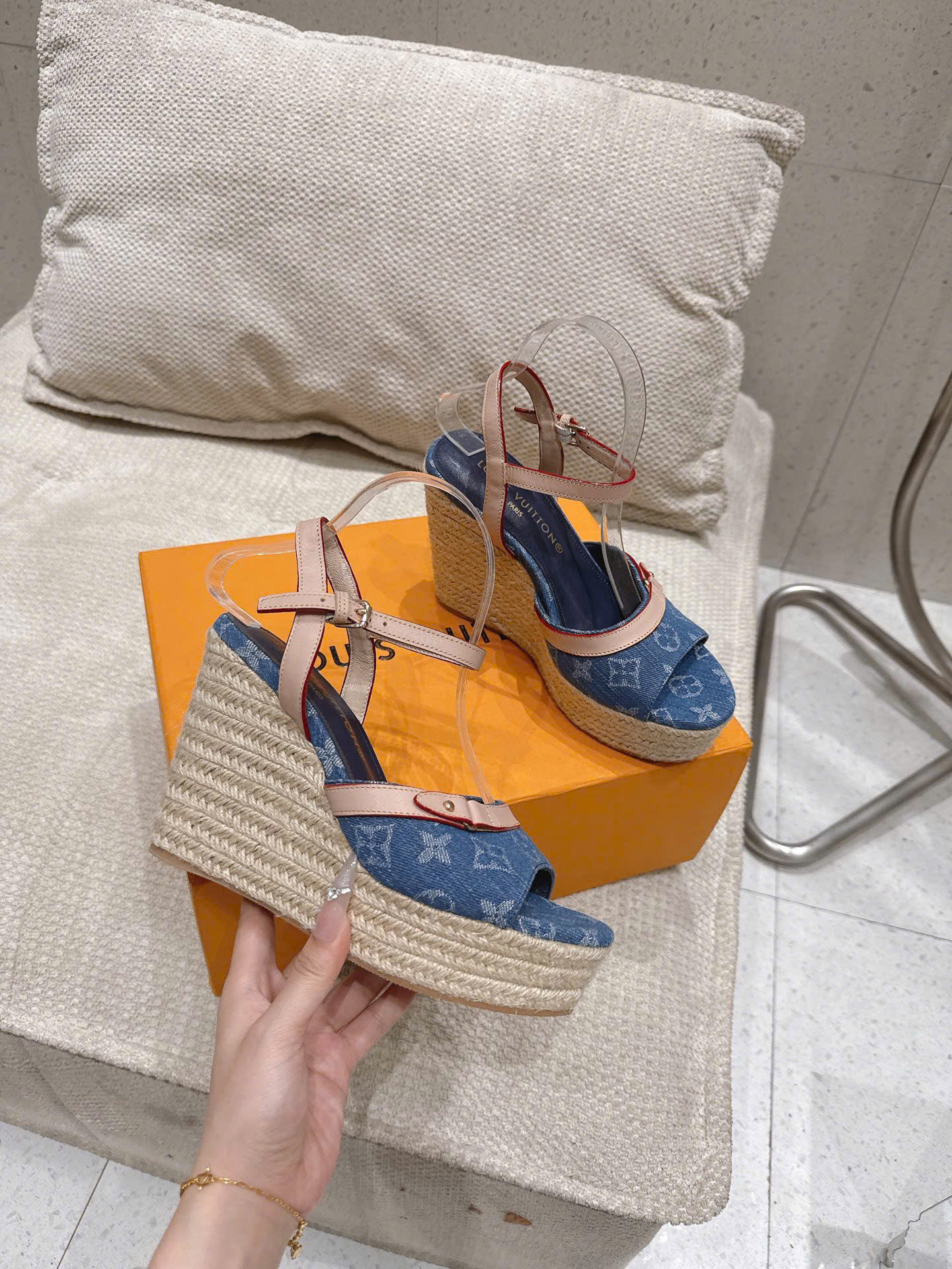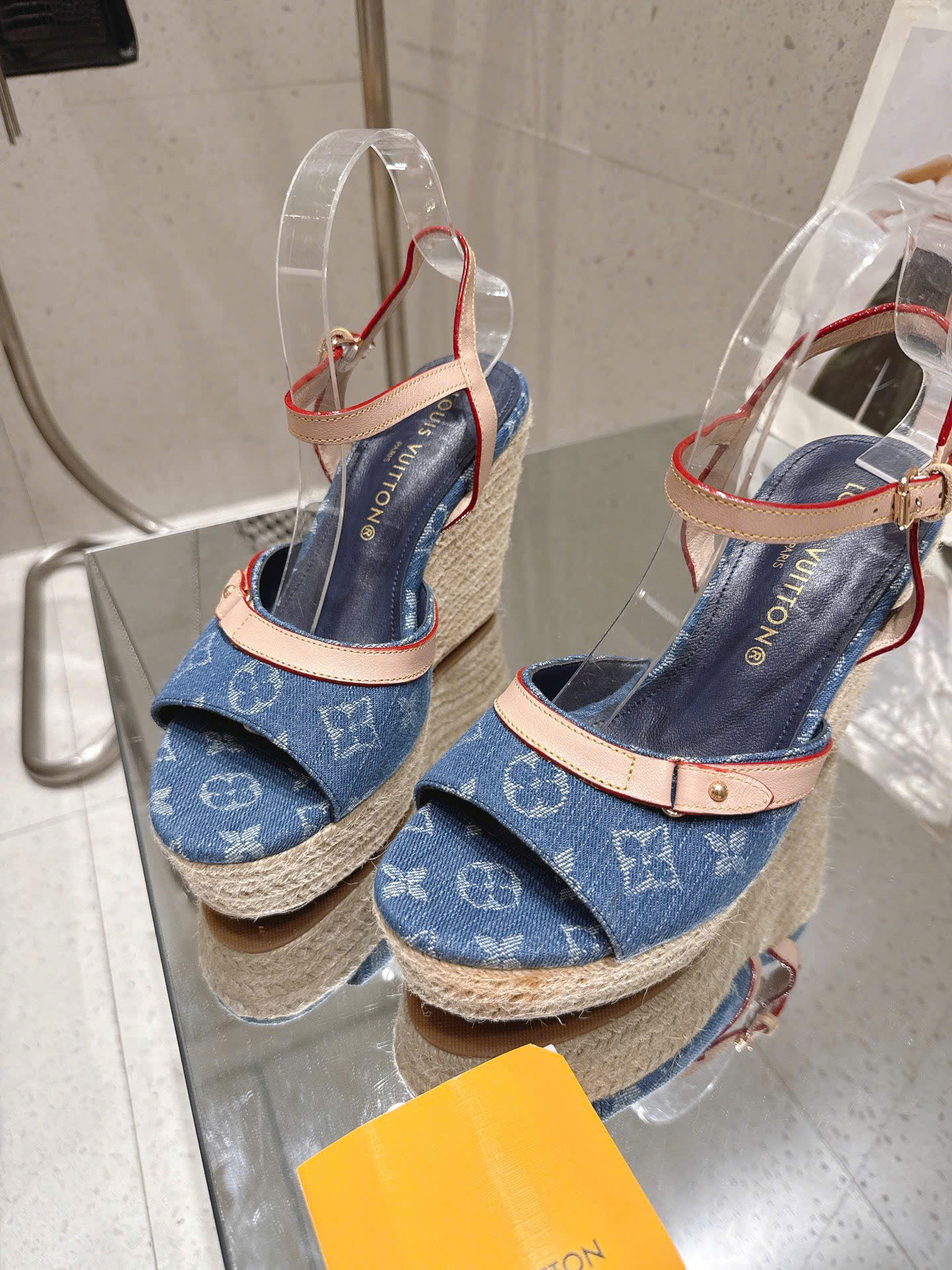 • Tên sản phẩm: Sandal LV Helios Wedge Denim Monogram – Siêu cấp