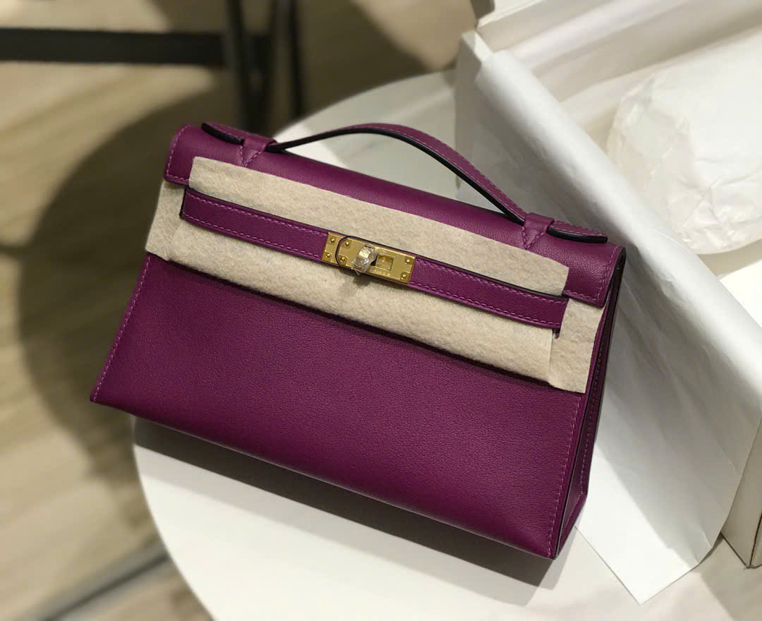 Túi cầm tay Kelly Pochette Swift Hermès siêu cấp màu tím hải quỳ khóa vàng