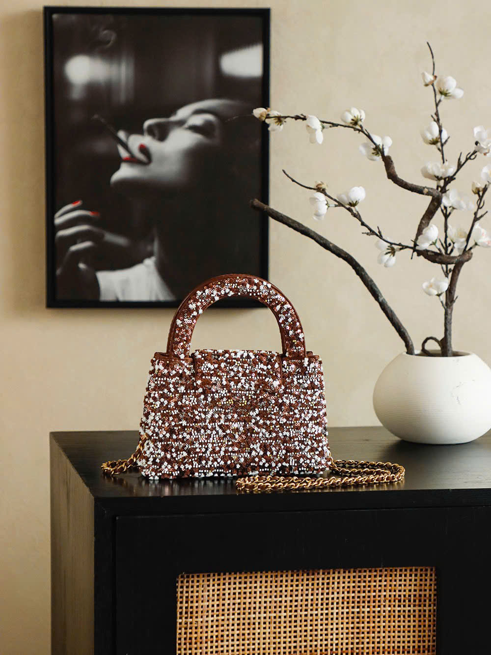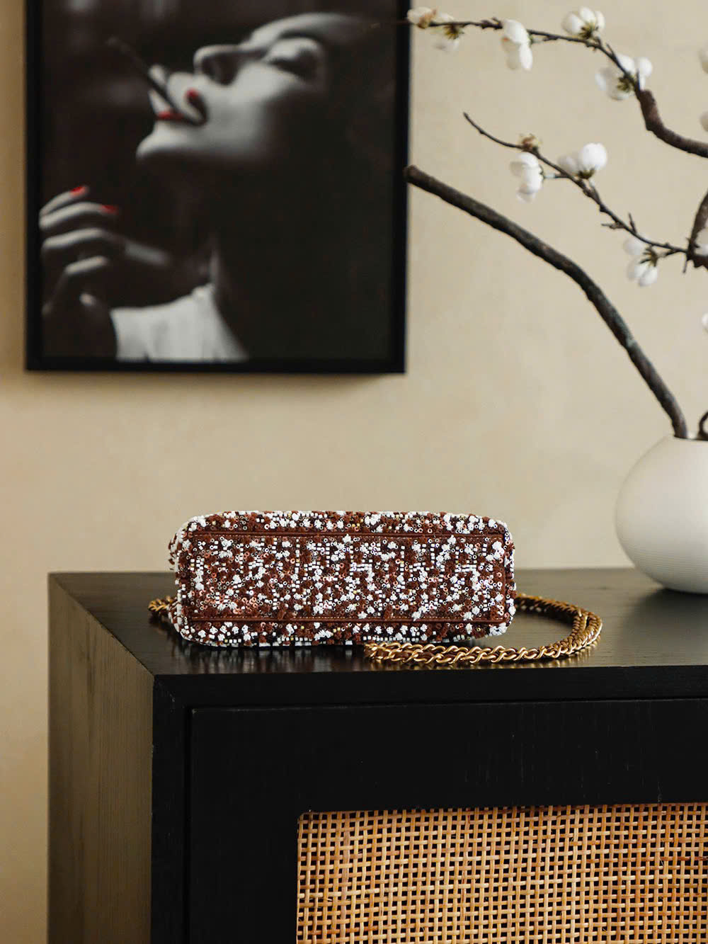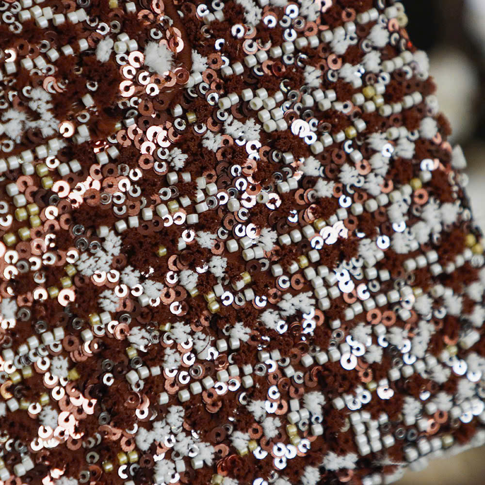 • Nền vải màu nâu kết hợp đính hạt và sequin dày, tạo hiệu ứng lấp lánh nổi bật.