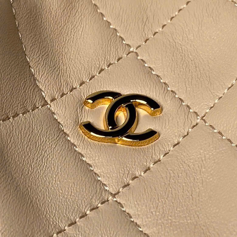 • Họa tiết chần bông kinh điển kết hợp logo Double C kim loại vàng, nổi bật và sang trọng.