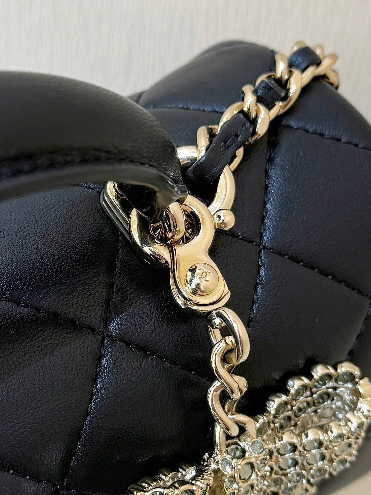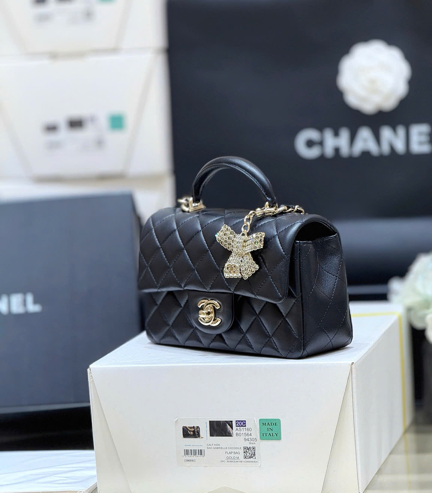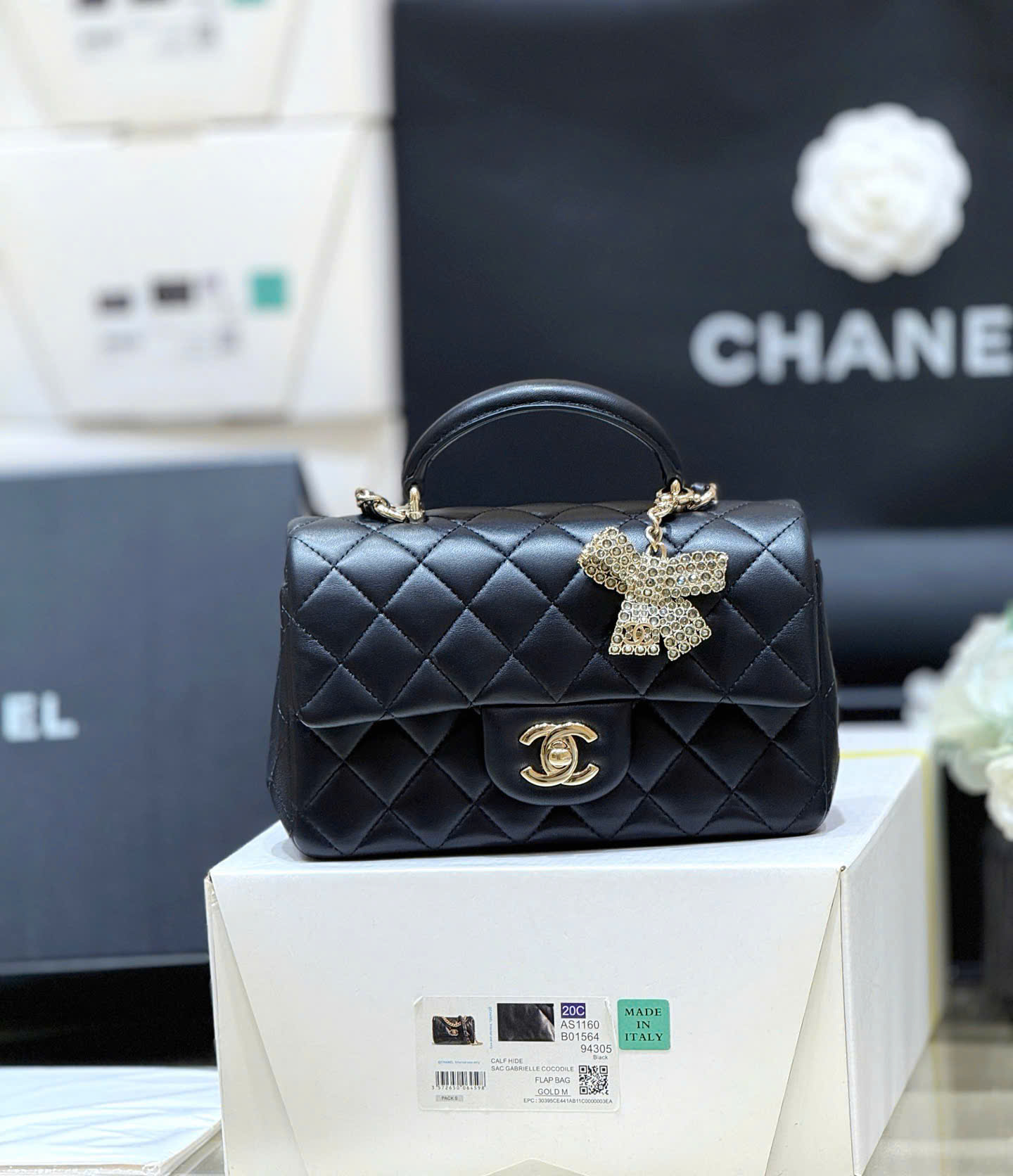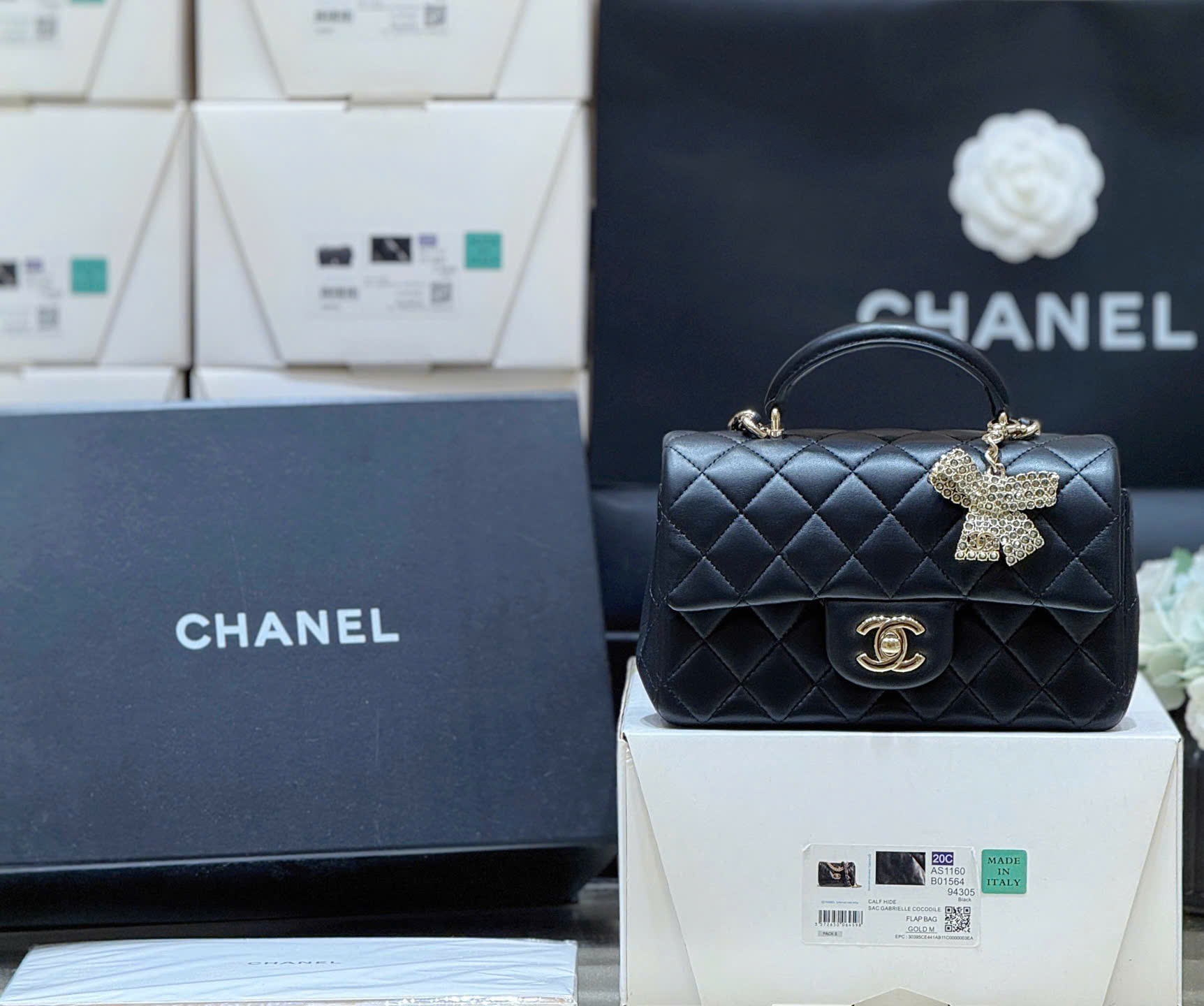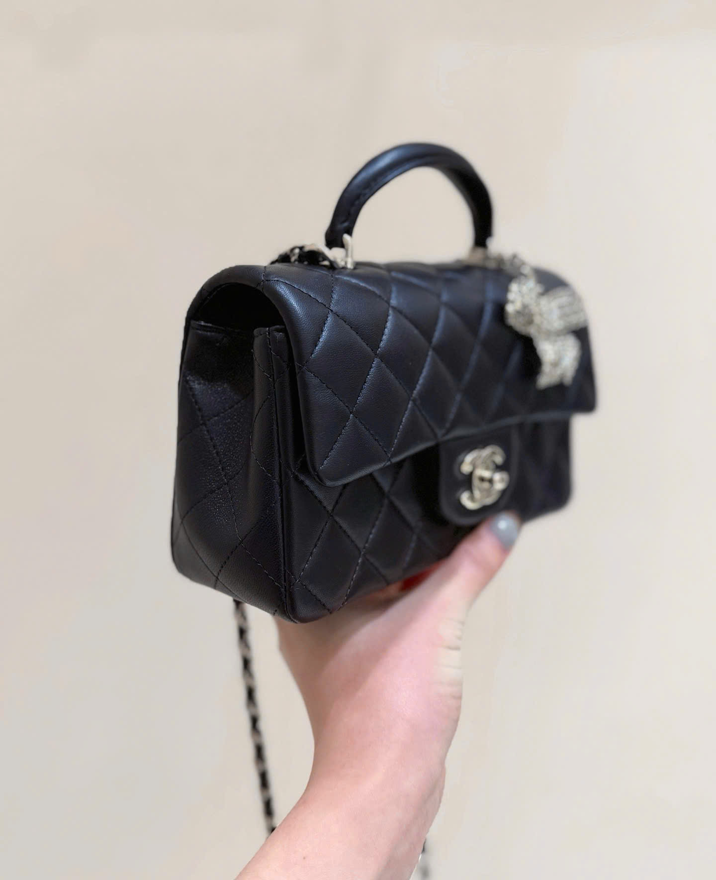 • Thiết kế Chanel Classic Flap Mini Top Handle, phiên bản đặc biệt nơ đính đá (diamond bow) rất nữ tính và sang trọng.