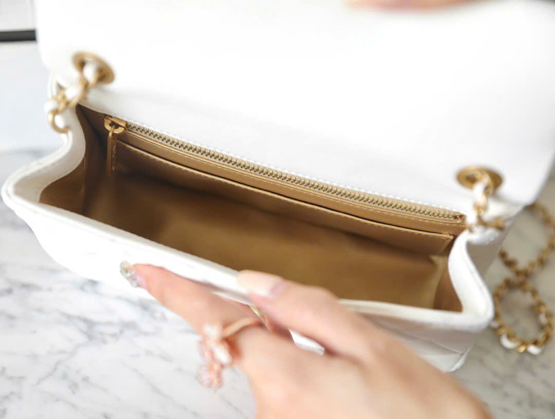 • Thiết kế Chanel Mini Flap Gold Ball phiên bản mới, sang trọng và tinh tế. • Chi tiết nút bi vàng (Gold Ball) giúp điều chỉnh độ dài dây linh hoạt. • Chất liệu da cừu cao cấp, mềm mại và mịn đẹp. • Lớp lót da bê cao cấp, tăng độ bền và cảm giác sang trọng. • Phụ kiện kim loại đồng mạ vàng 24K, sáng đẹp và chắc chắn. • Form túi mini nhỏ gọn, đáy túi phẳng tinh tế. • Dây xích đeo vai hoặc đeo chéo, dễ dàng thay đổi phong cách. • Nắp gập cổ điển (Flap) mang phong cách CF kinh điển. • Ngăn chứa tiện dụng, đựng điện thoại, son, thẻ và vật dụng nhỏ. • Phù hợp đi tiệc, đi chơi hoặc dạo phố. • Phong cách luxury – thanh lịch – nữ tính. • Màu trắng trang nhã, dễ phối nhiều outfit. • Phiên bản Like Auth, hoàn thiện chi tiết sắc nét. • Dáng túi mang giá trị sưu tầm cao.