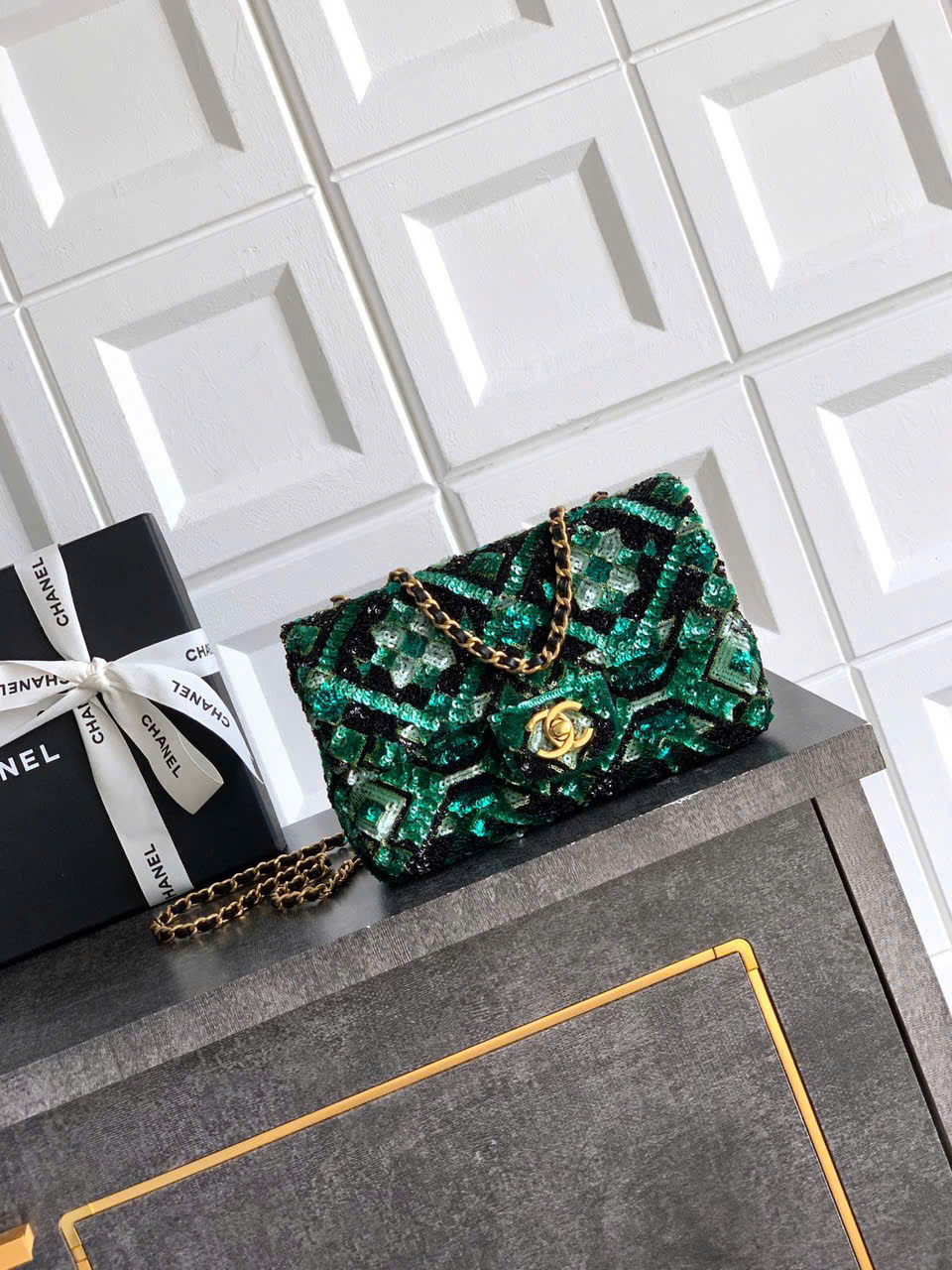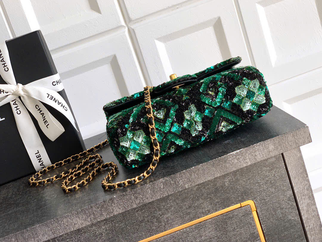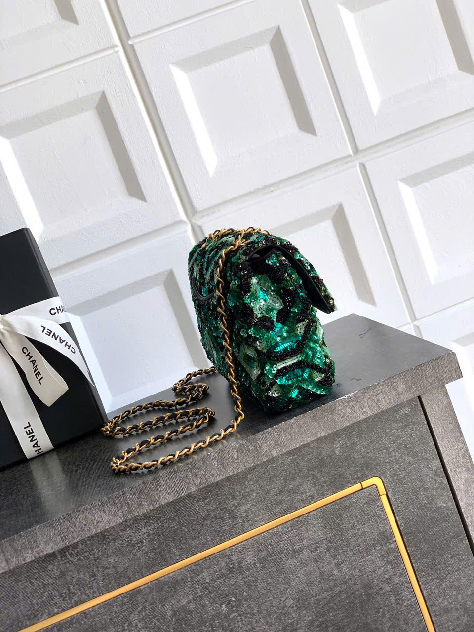 - Tên Sản Phẩm: Túi Xách Chanel Siêu VIP CF Dáng Mini Đính Cườm Thêu Sequin Màu Xanh Lục Bảo Handcraft
