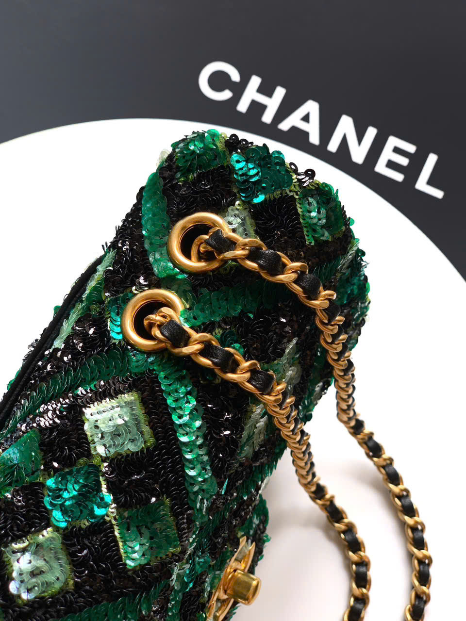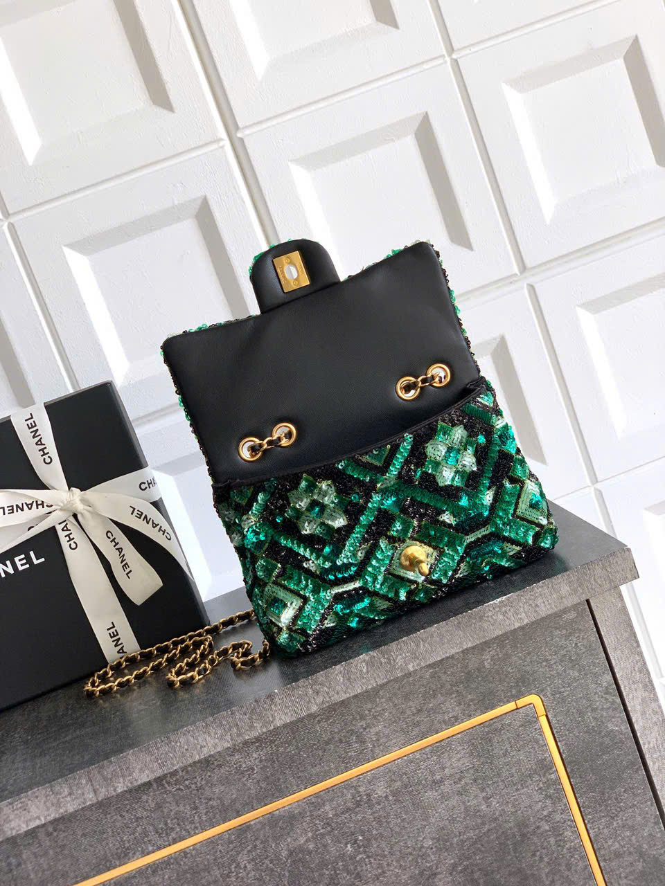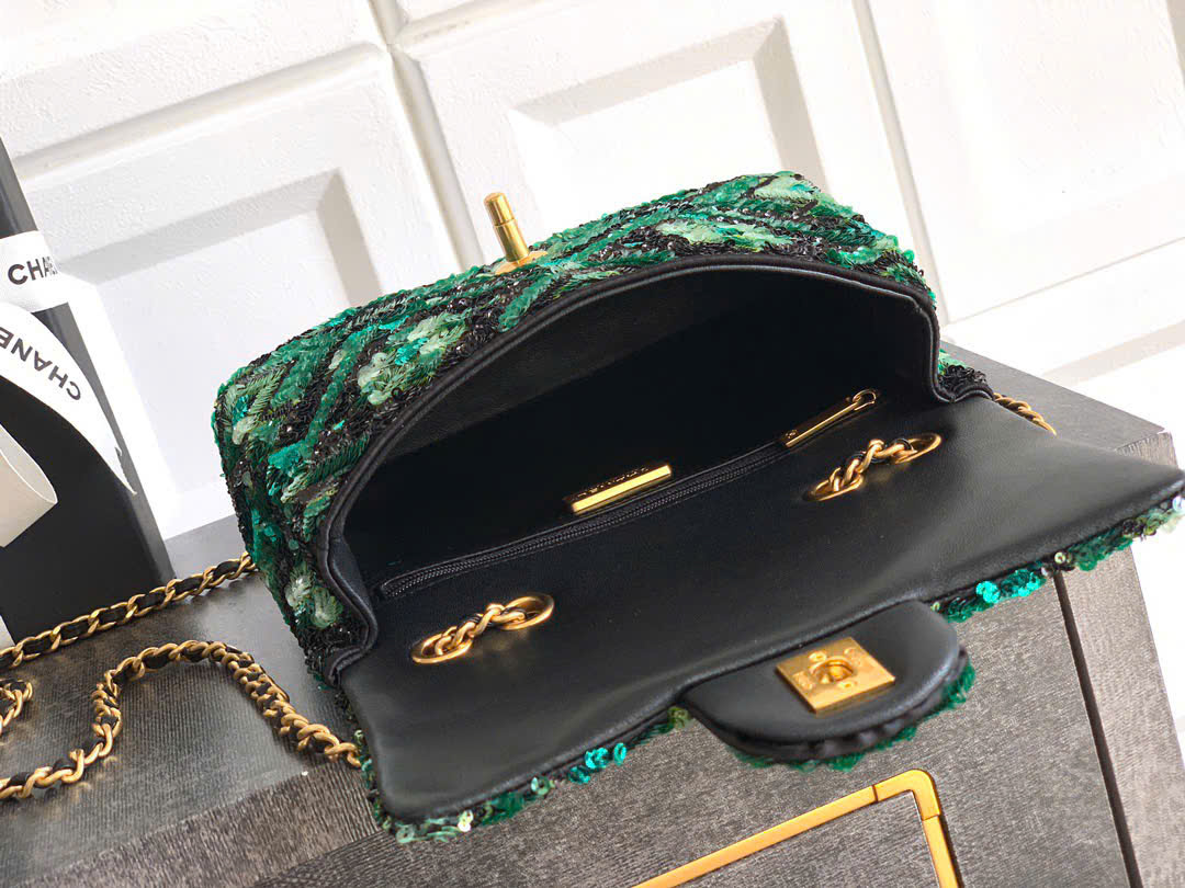 - Tên Sản Phẩm: Túi Xách Chanel Siêu VIP CF Dáng Mini Đính Cườm Thêu Sequin Màu Xanh Lục Bảo Handcraft