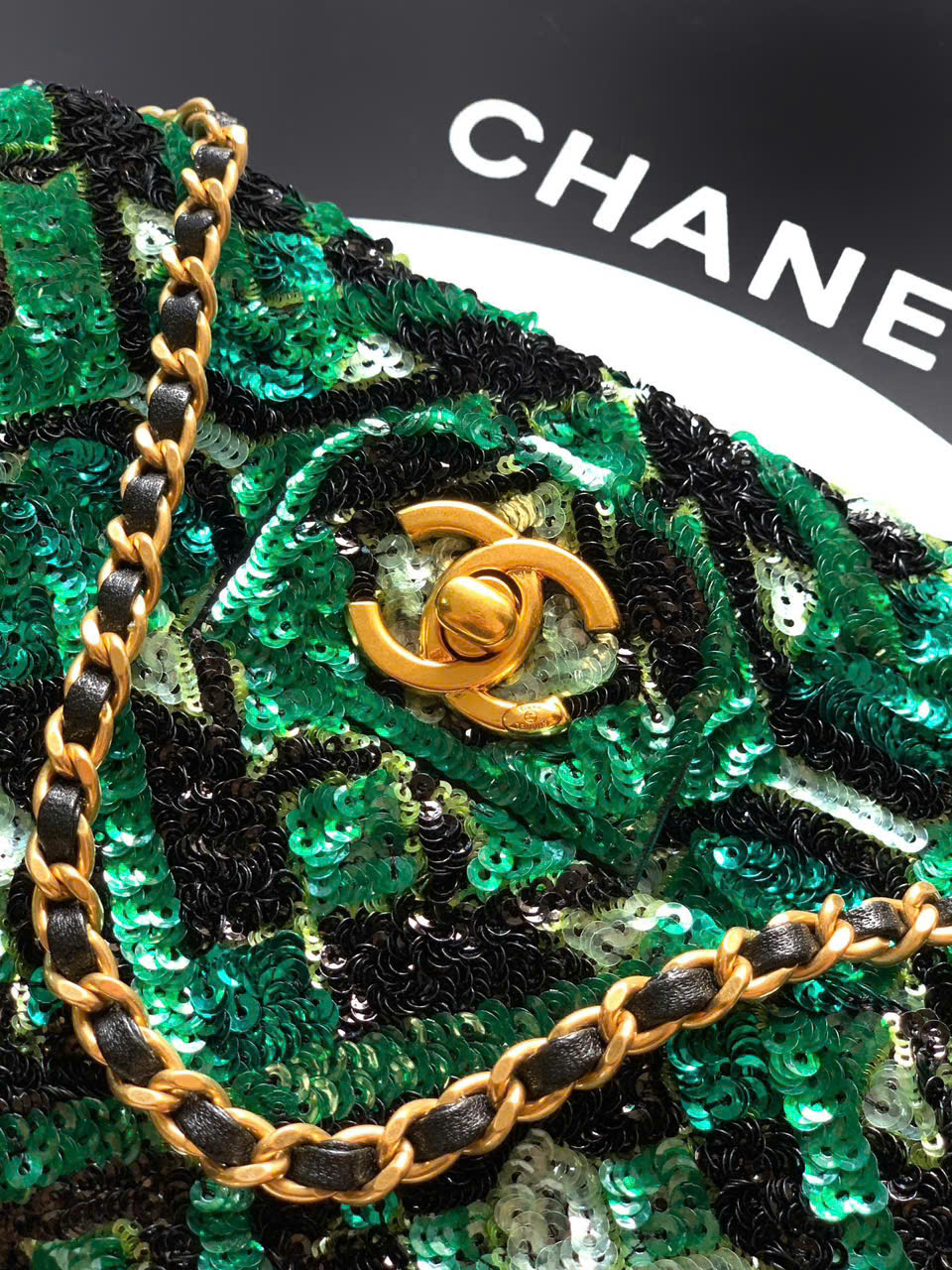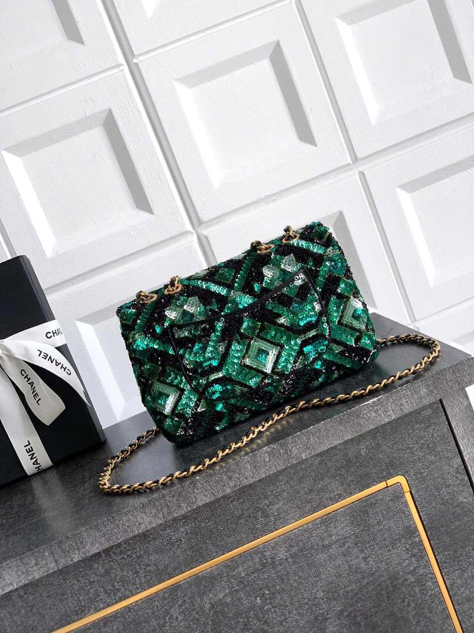 Túi Xách Chanel Siêu VIP CF Đính Cườm Thêu Sequin Màu Xanh Lục Bảo Handcraft