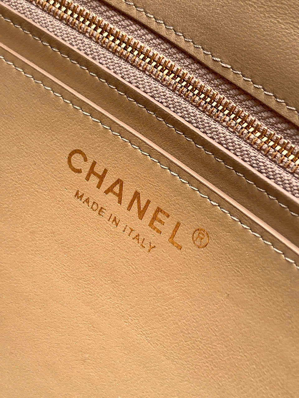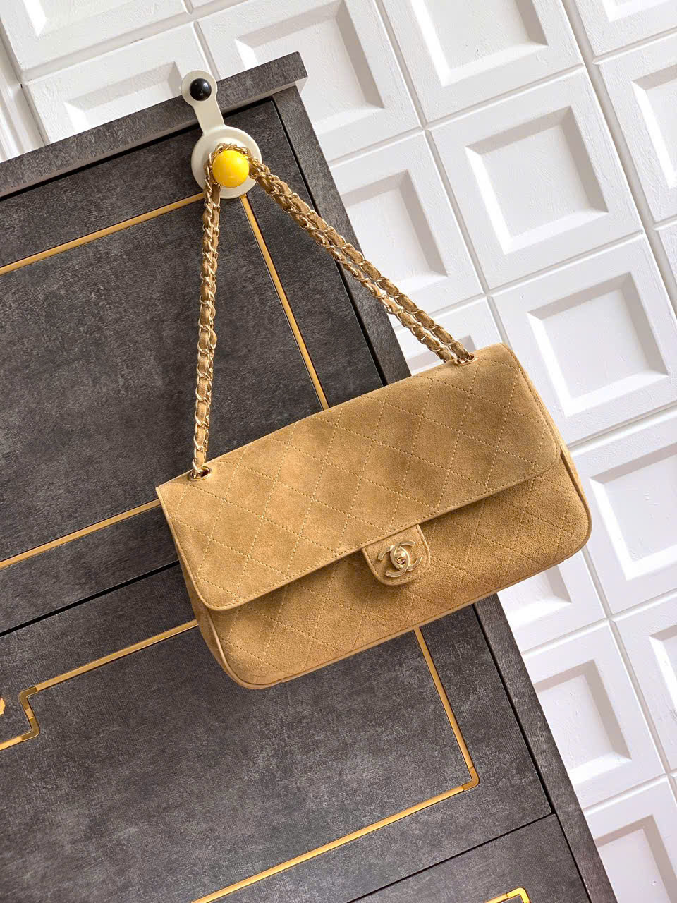 • Họa tiết chần trám kinh điển kết hợp khóa đôi C kim loại mạ vàng nổi bật