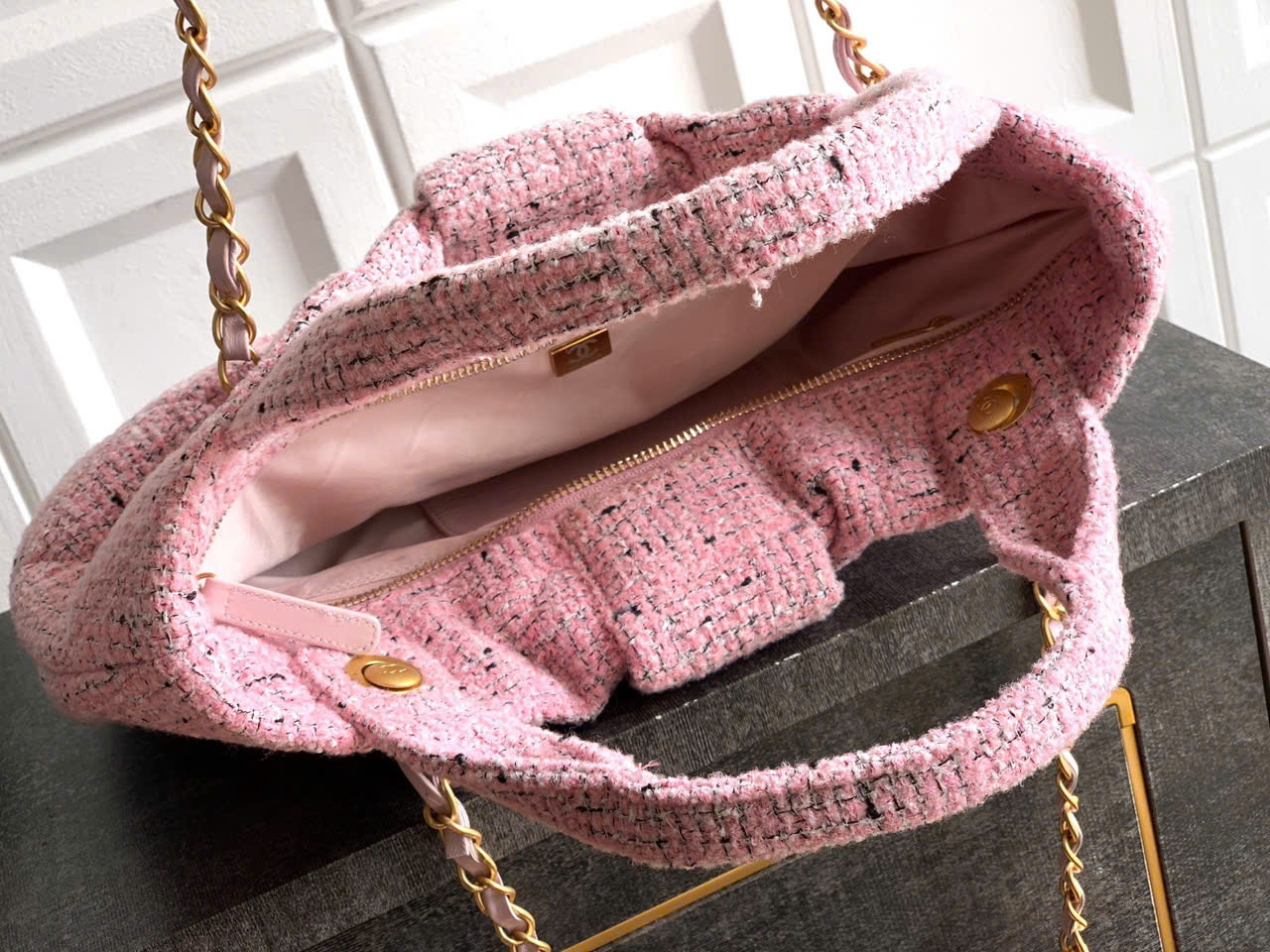 • Bề mặt tweed màu hồng nhạt thanh lịch, dệt sợi nổi đẹp mắt, tạo cảm giác sang – xịn – chuẩn phong cách Chanel.