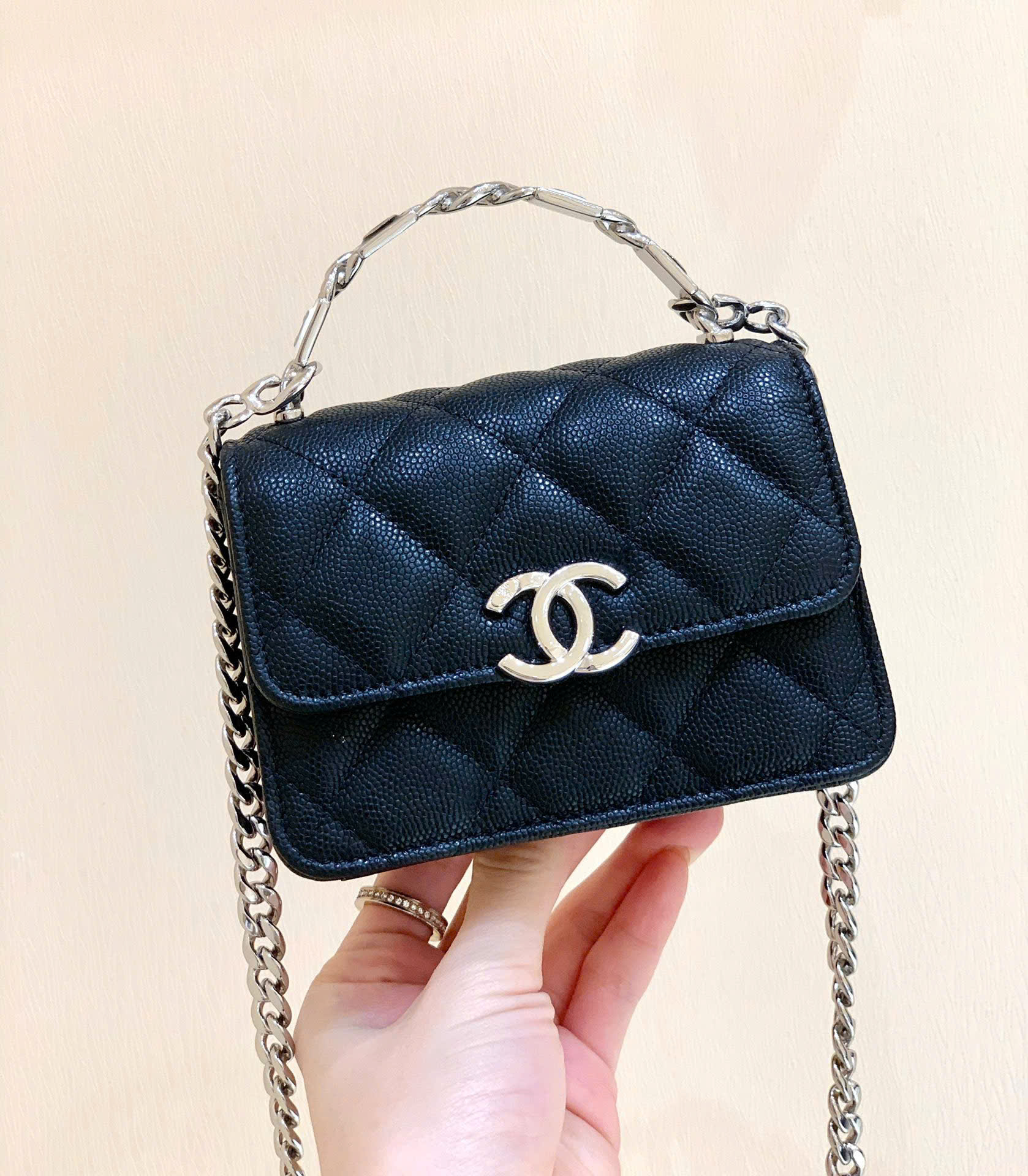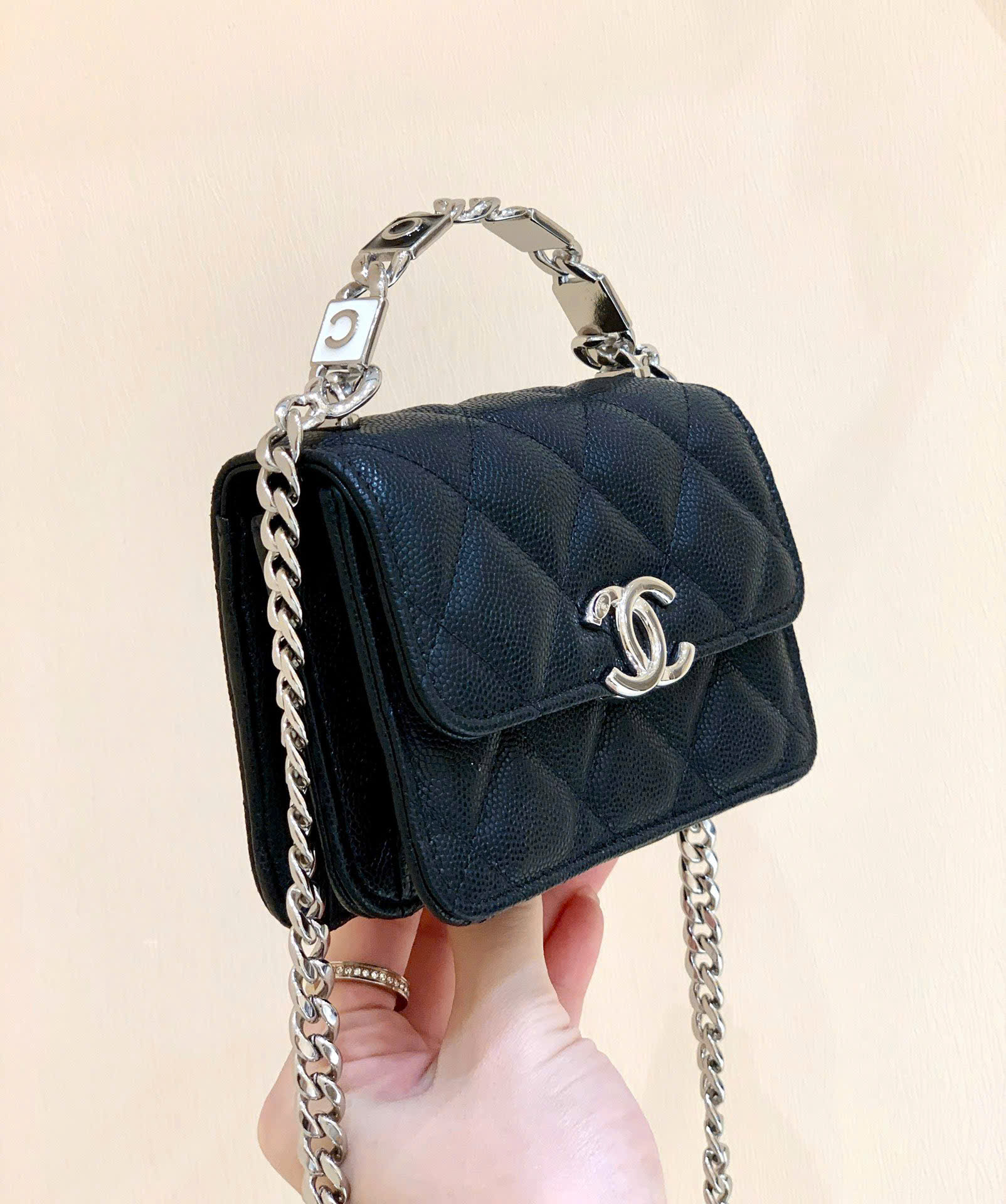 Kích thước: 13 x 9.5 x 6 cm Tên sản phẩm: Túi Đeo Chéo Mini Chanel 2022 CC Enamel Handle Mini Bag Tay Cầm Men – Like Auth Mã sản phẩm: AP2758 Mô tả sản phẩm: