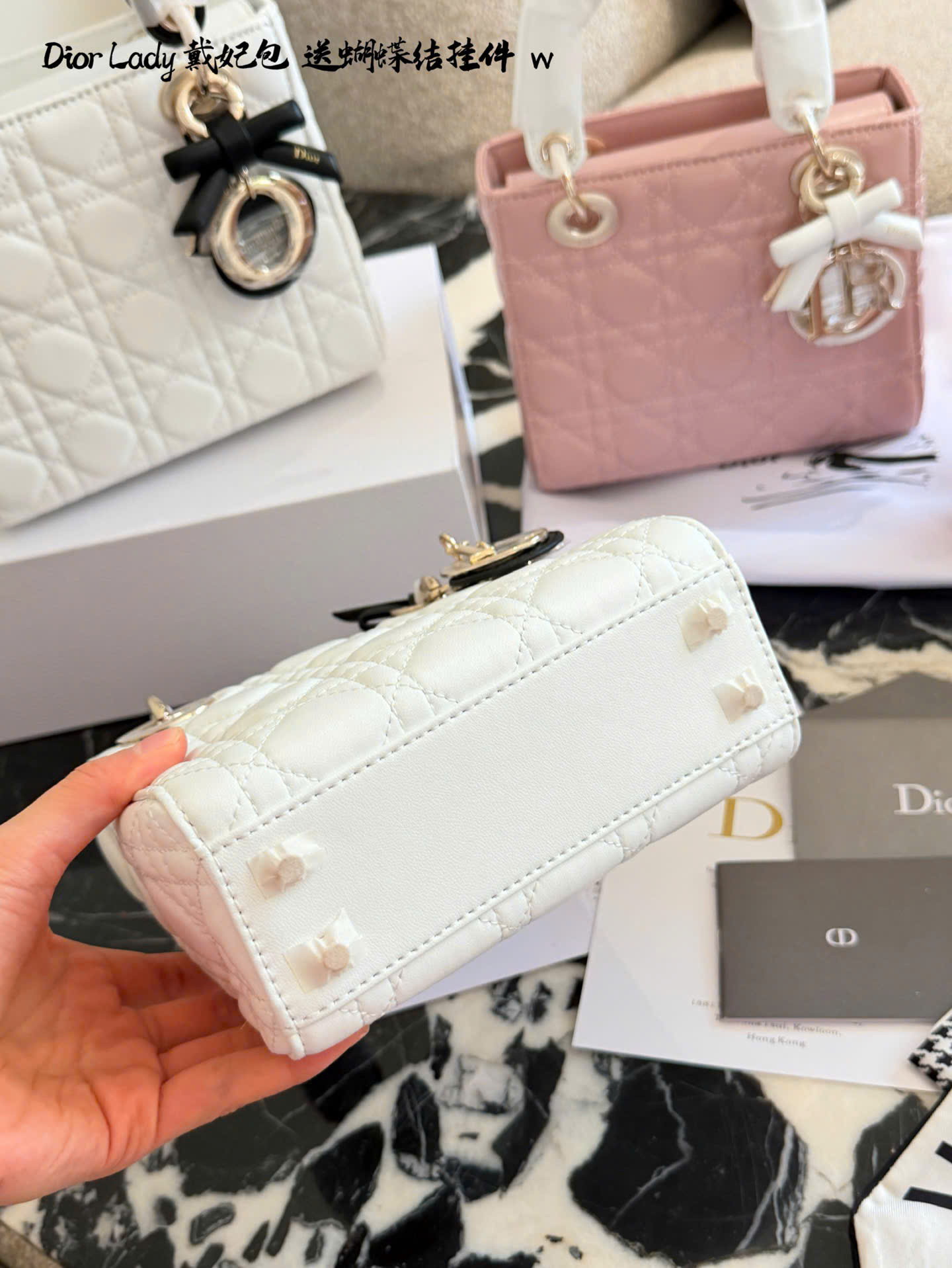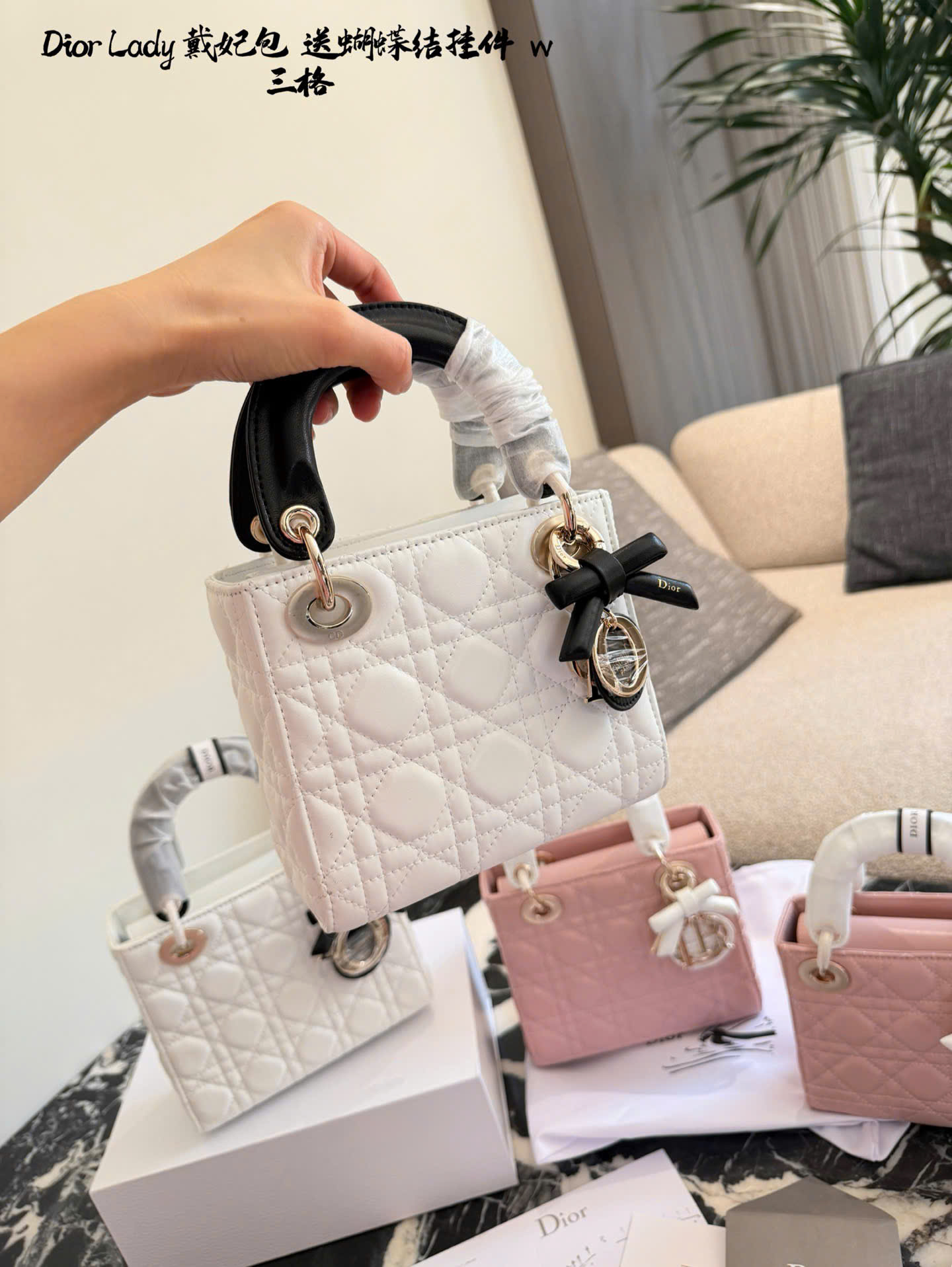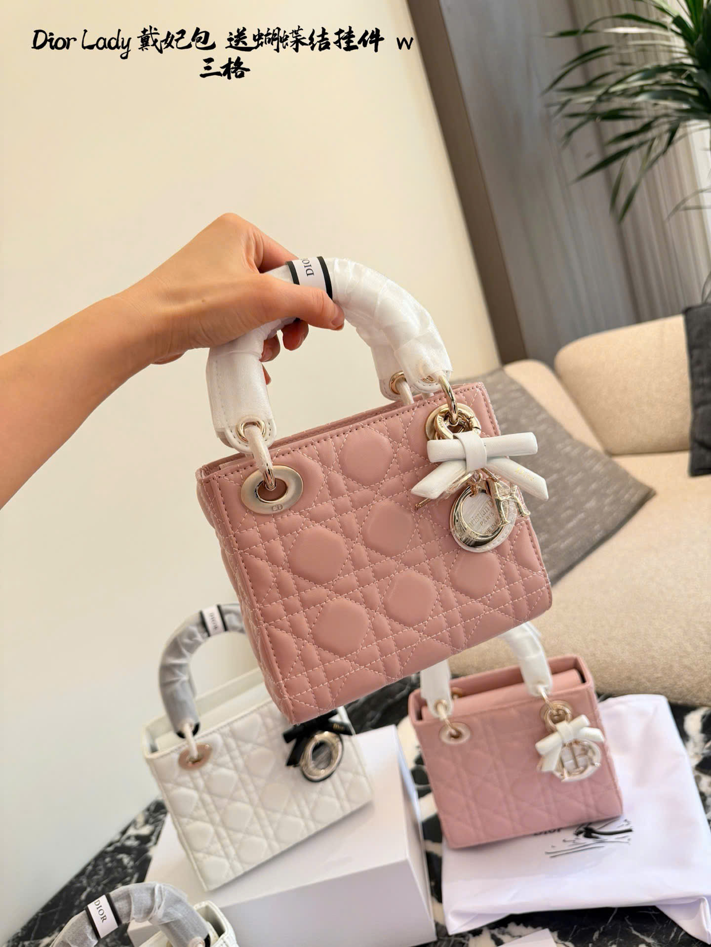 • Mẫu Lady Dior kinh điển, thiết kế 3 ô và 4 ô thanh lịch. • Chất liệu da cừu cao cấp, mềm mại, form chuẩn đẹp. • Họa tiết Cannage đặc trưng, tăng độ nhận diện thương hiệu Dior. • Tay cầm trắng phối nơ, tạo điểm nhấn nữ tính, tinh tế. • Charm D.I.O.R kim loại màu vàng nhạt, sang trọng và nổi bật. • Có thể xách tay, đeo vai hoặc đeo chéo, linh hoạt sử dụng hằng ngày. • Tông màu hồng nhẹ nhàng, dễ phối trang phục mùa xuân hè. • Phiên bản siêu cấp, hoàn thiện tinh xảo, phù hợp sử dụng hoặc làm quà tặng. • Màu sắc: hồng phối tay cầm trắng