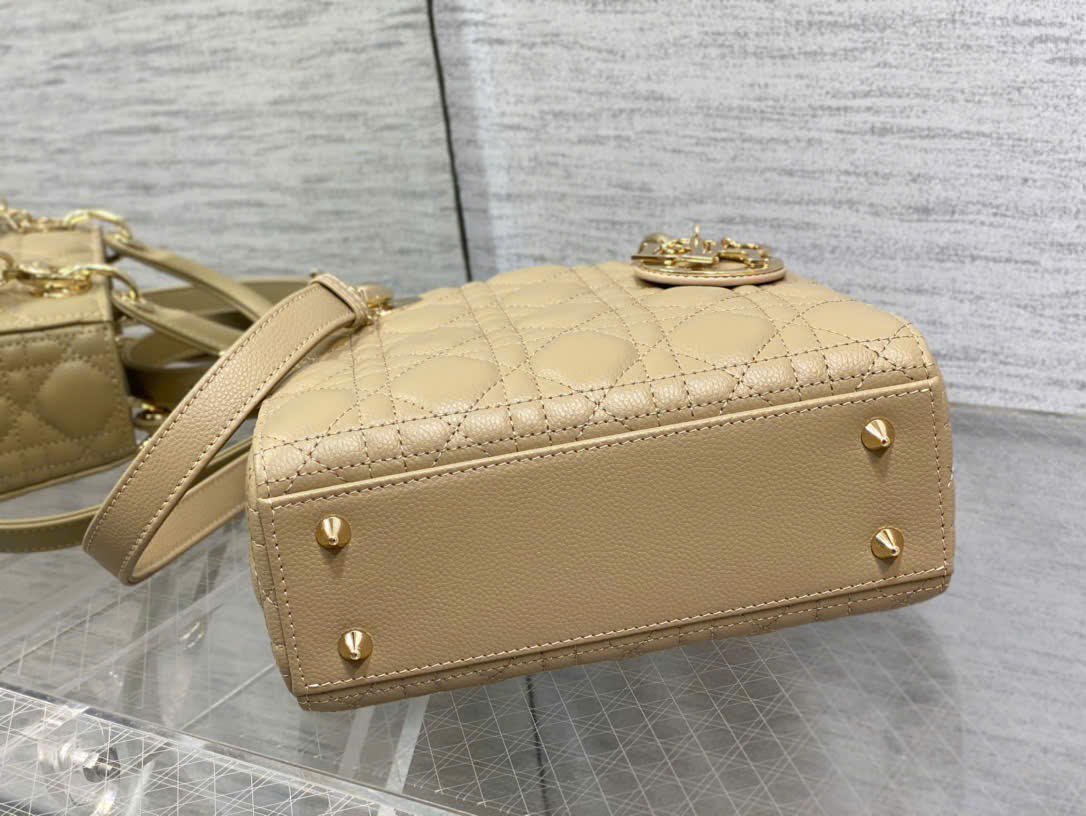 - Lady Dior 4 ô da bò vân bi (da hạt), màu trà sữa thanh lịch, dễ phối đồ