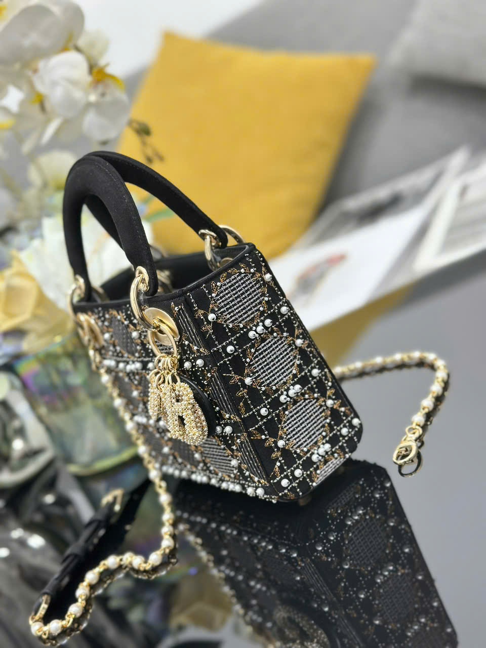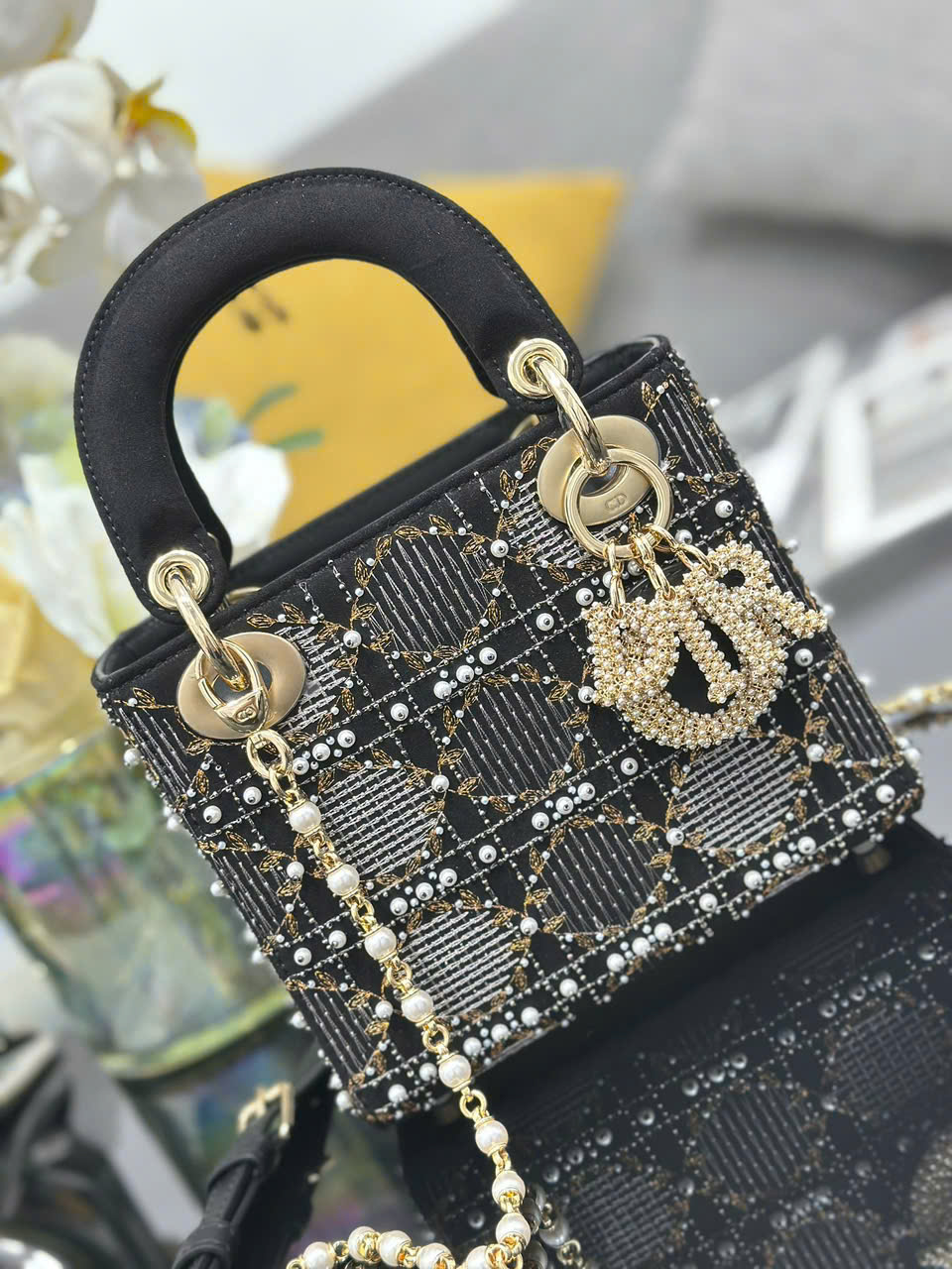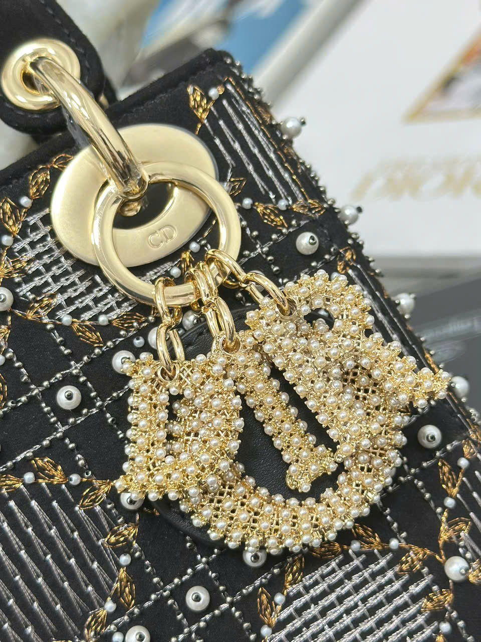 Túi xách Lady Dior siêu vip ba ngăn thêu ngọc trai