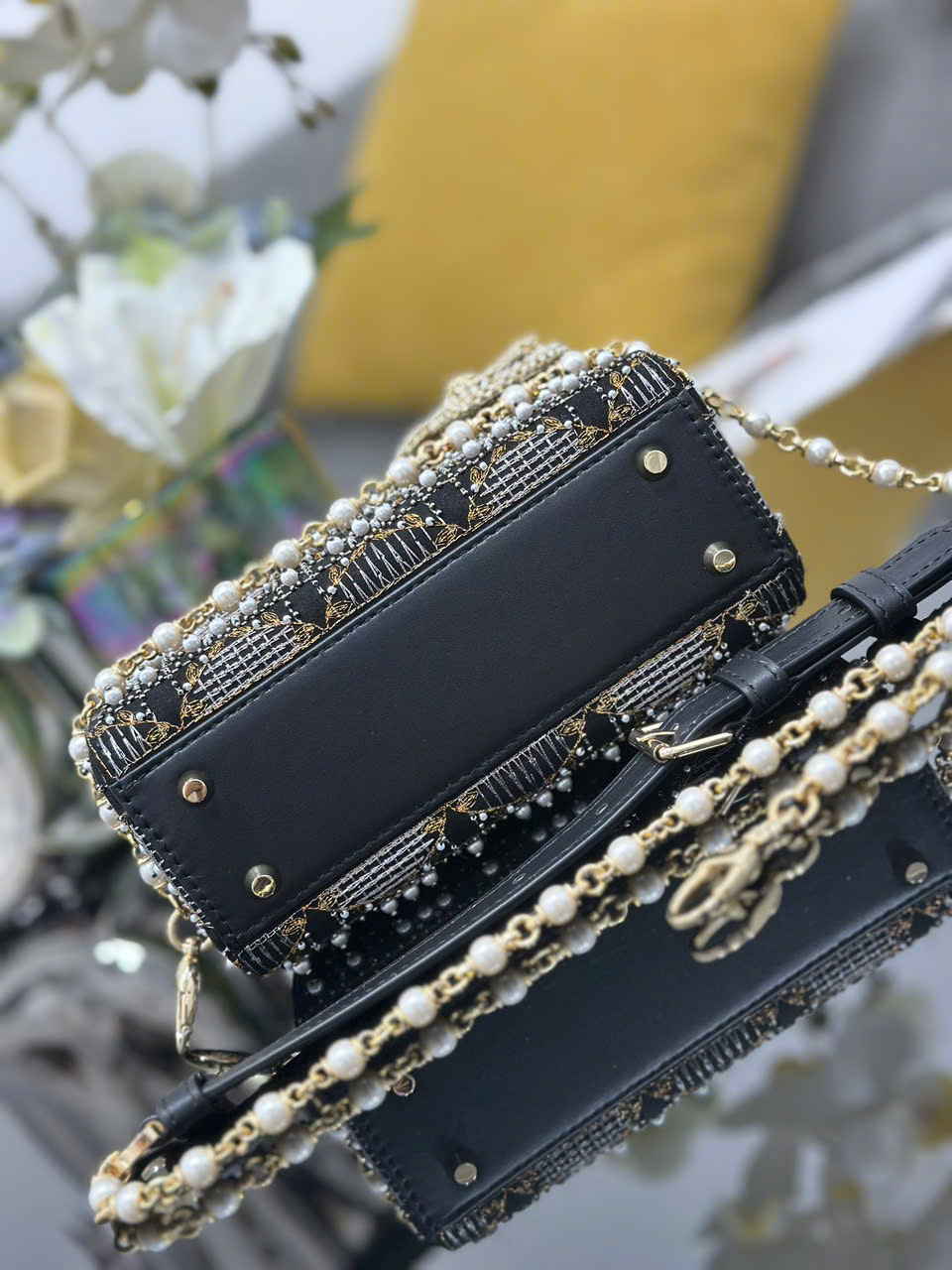 • Toàn bộ thân túi được thêu họa tiết Cannage (vân chần quả trám) bằng ngọc trai lớn – nhỏ đính thủ công tỉ mỉ