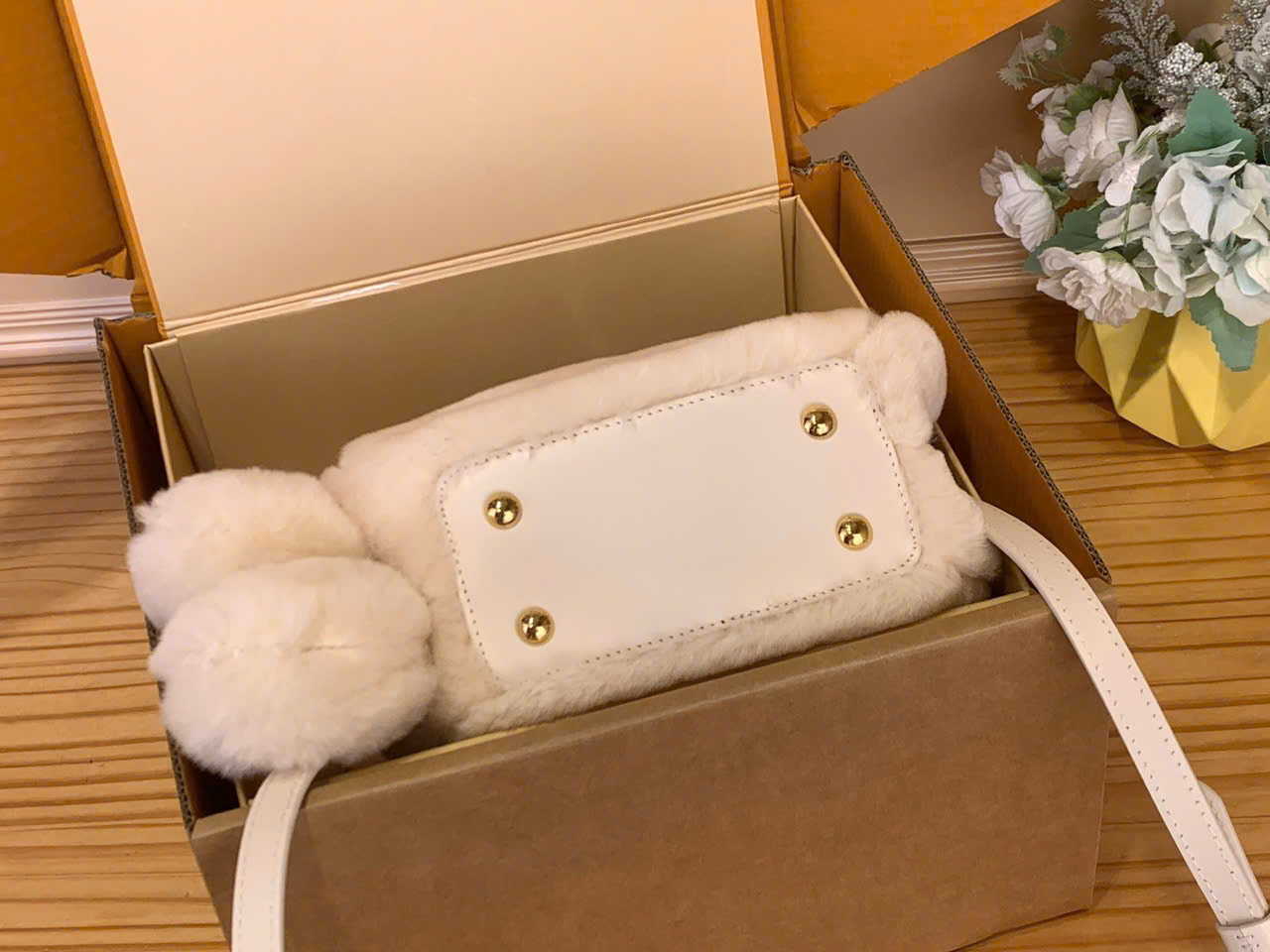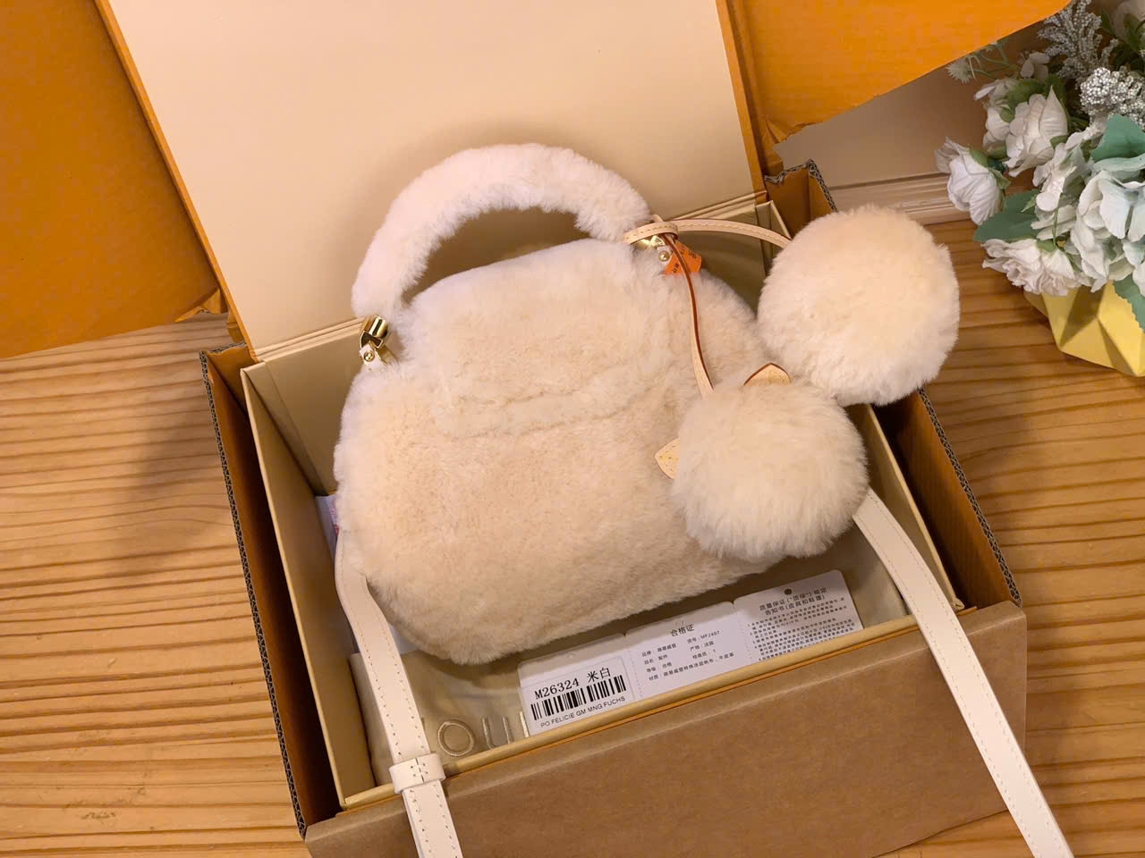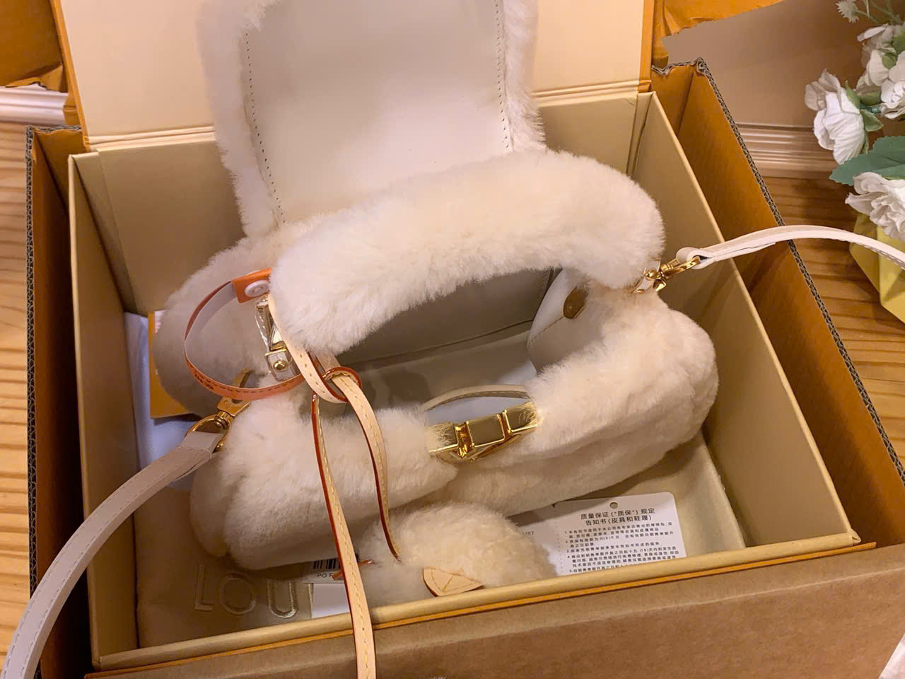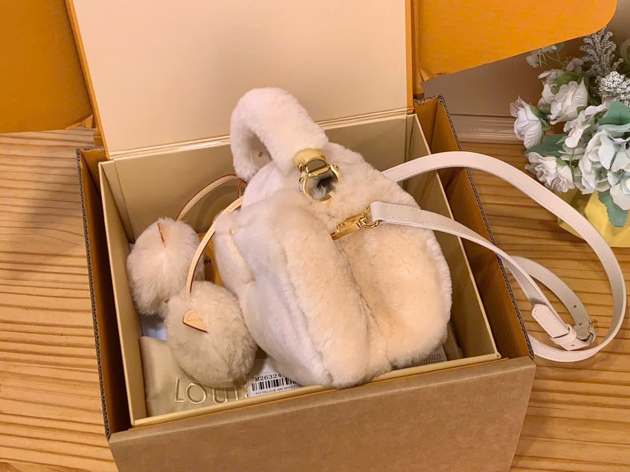 Tên sản phẩm: Túi xách Louis Vuitton siêu vip Capusnow m26324 màu kem lông cừu Kích thước: 13 × 11 × 20 cm (cao × rộng × dài)