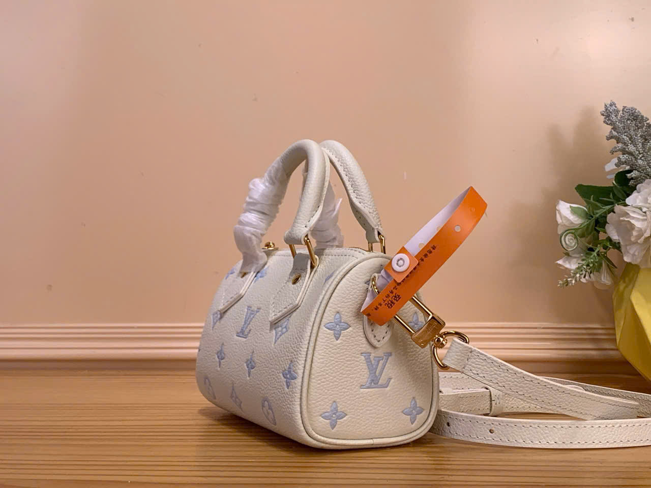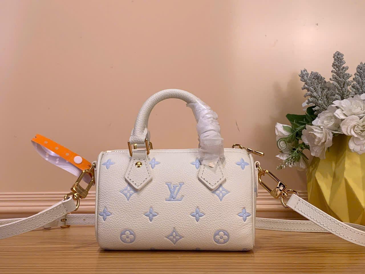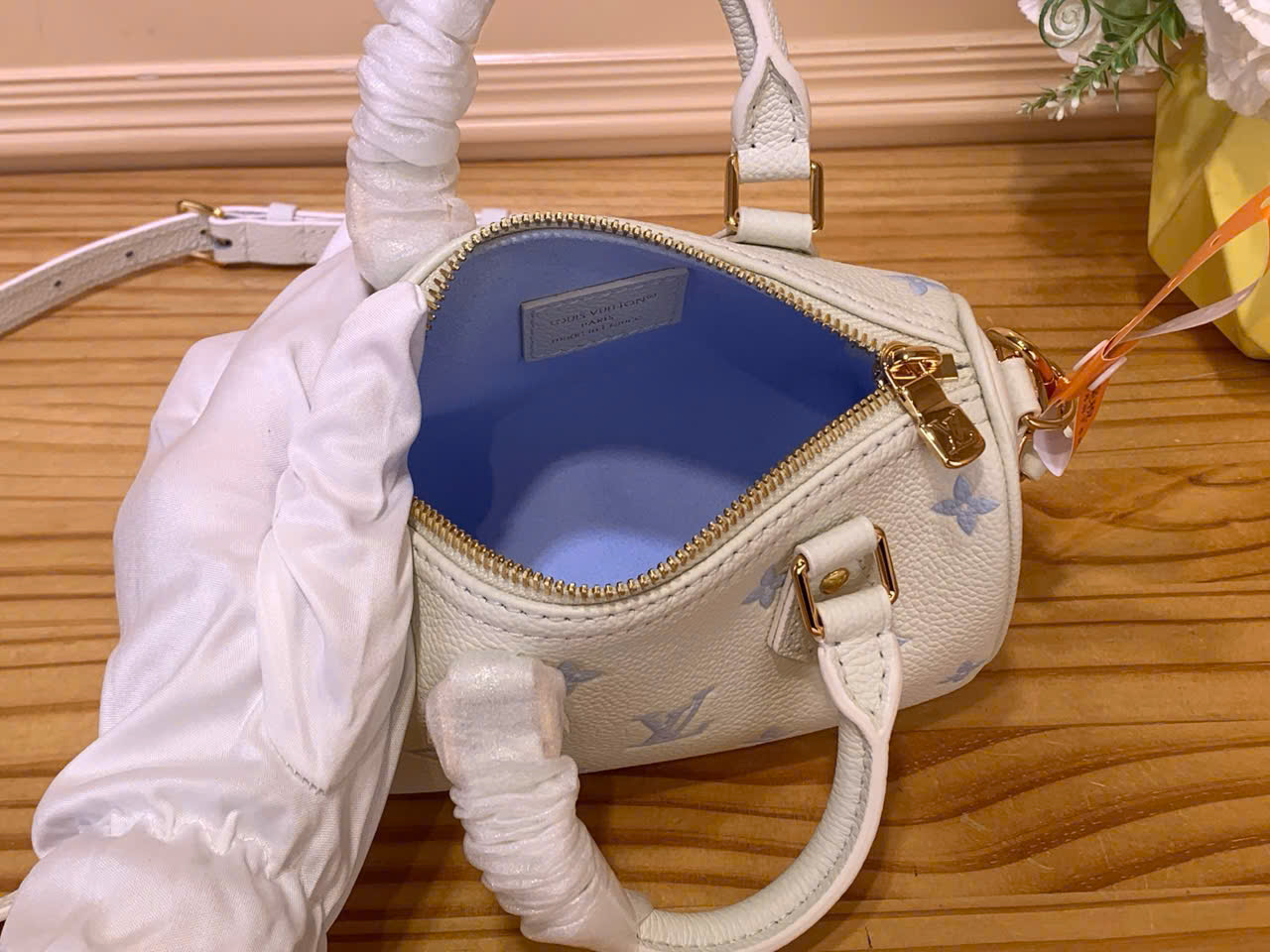 Tên sản phẩm: túi xách Louis Vuitton siêu vip Nano Speedy xanh dương in lụa Strawberry Milk