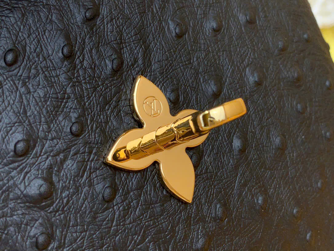 Phần viền trên của túi được trang trí chi tiết hoa Monogram kim loại ánh vàng, tạo điểm nhấn thanh lịch, hài hòa với các phụ kiện kim loại tinh xảo.