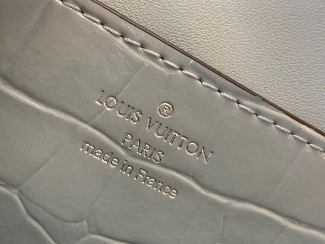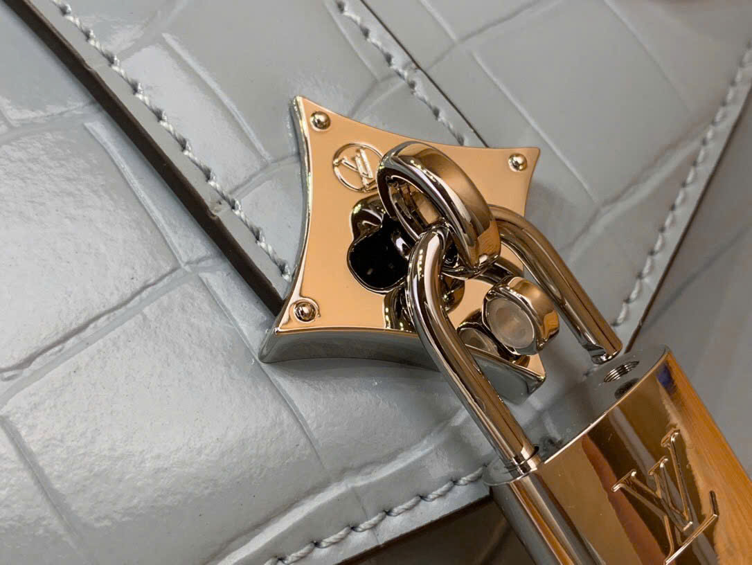 Chất liệu da vân cá sấu cao cấp kết hợp chi tiết hoa Monogram ánh kim tạo điểm nhấn sang trọng, tinh tế.