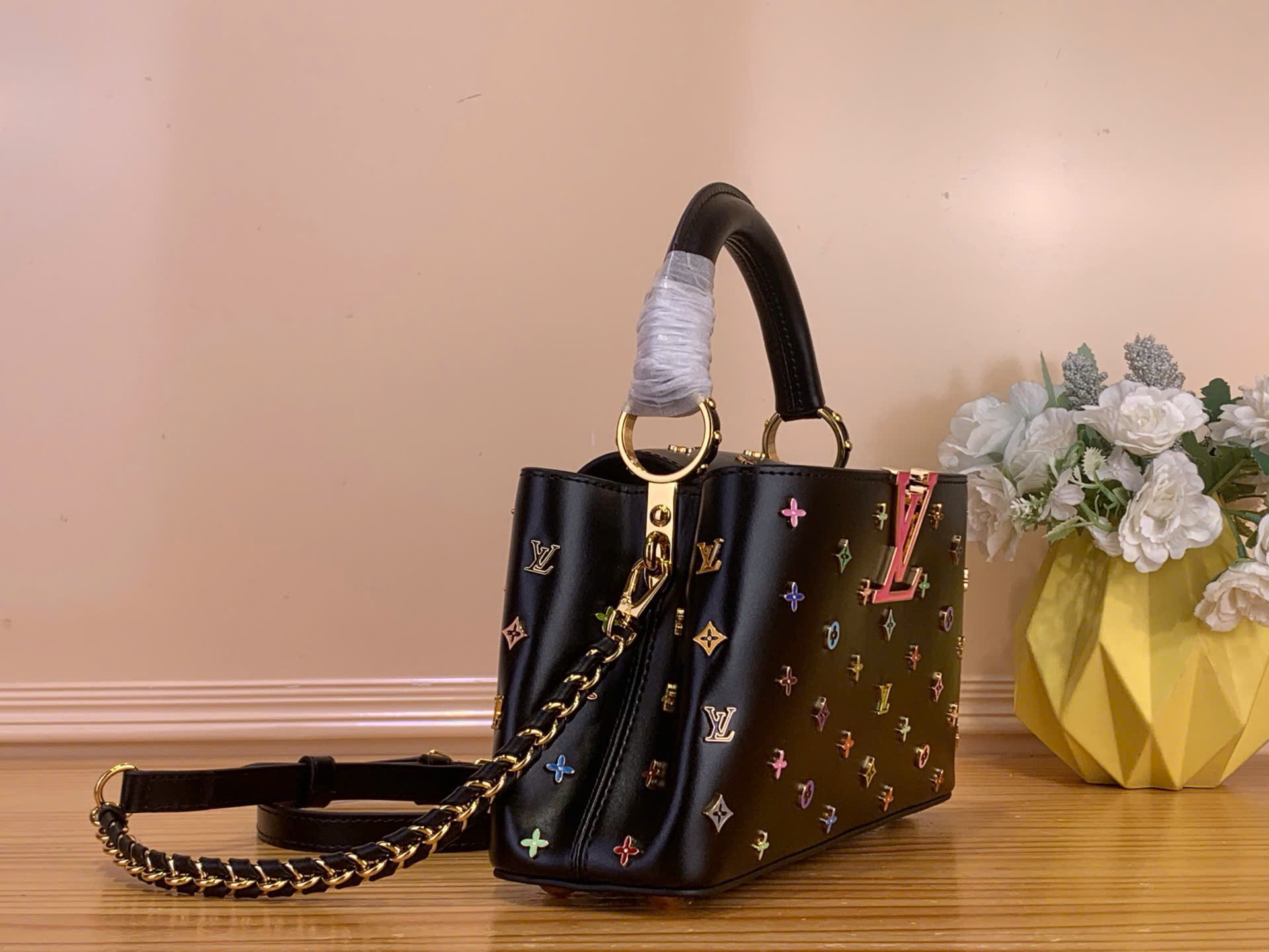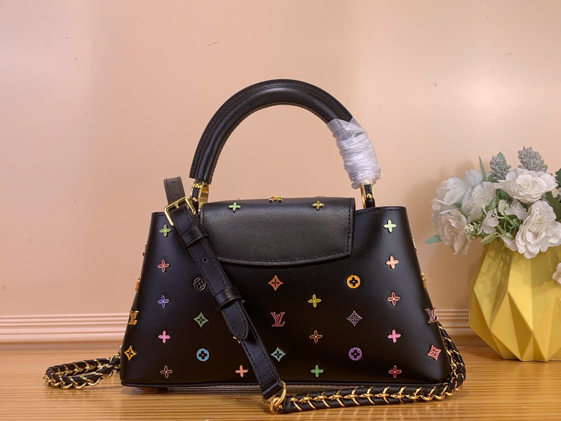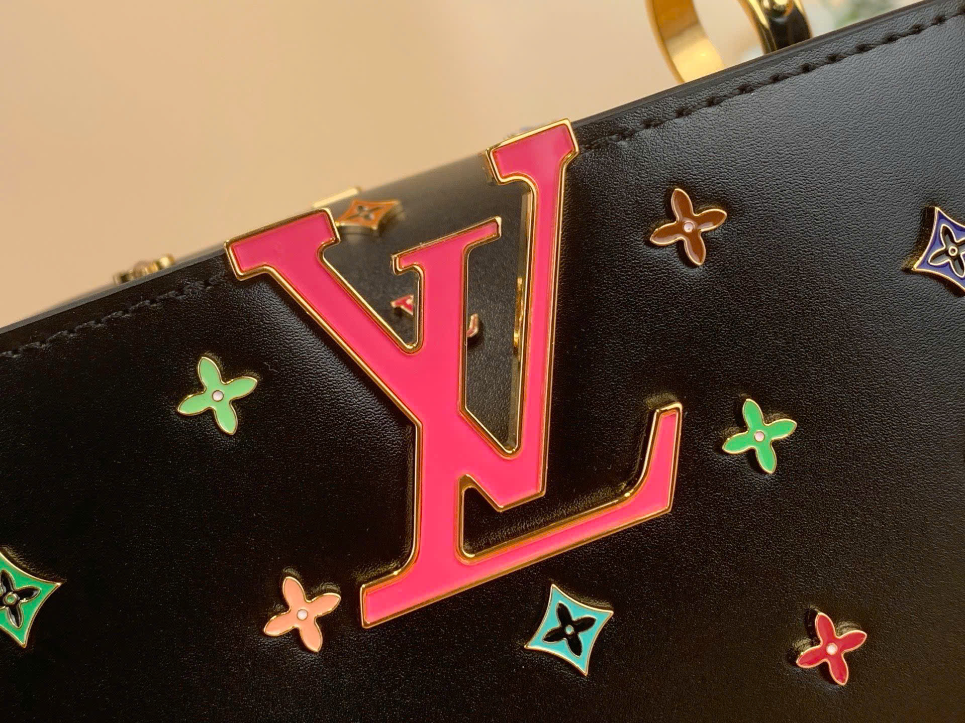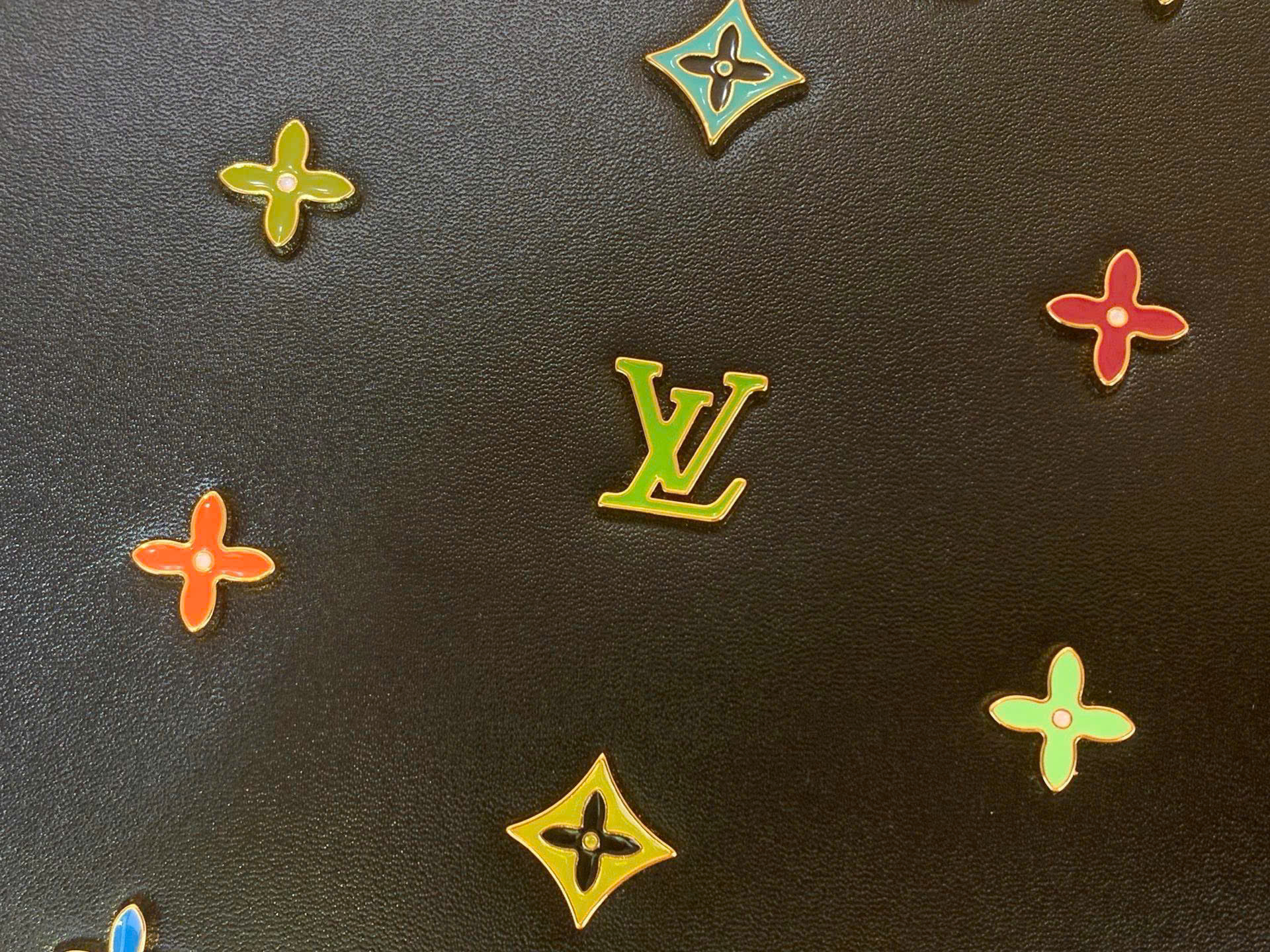 • Điểm nhấn hoa LV tráng men đa sắc nổi bật trên nền đen cá tính
