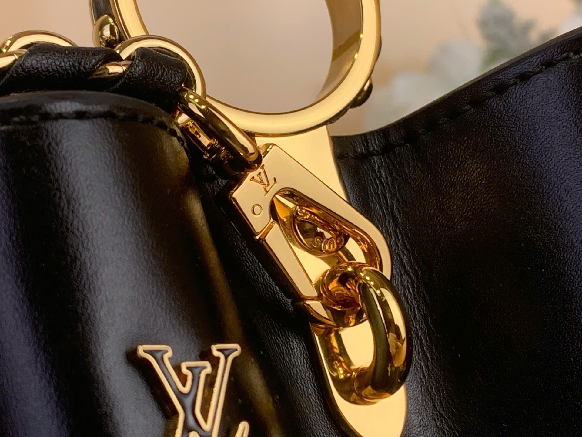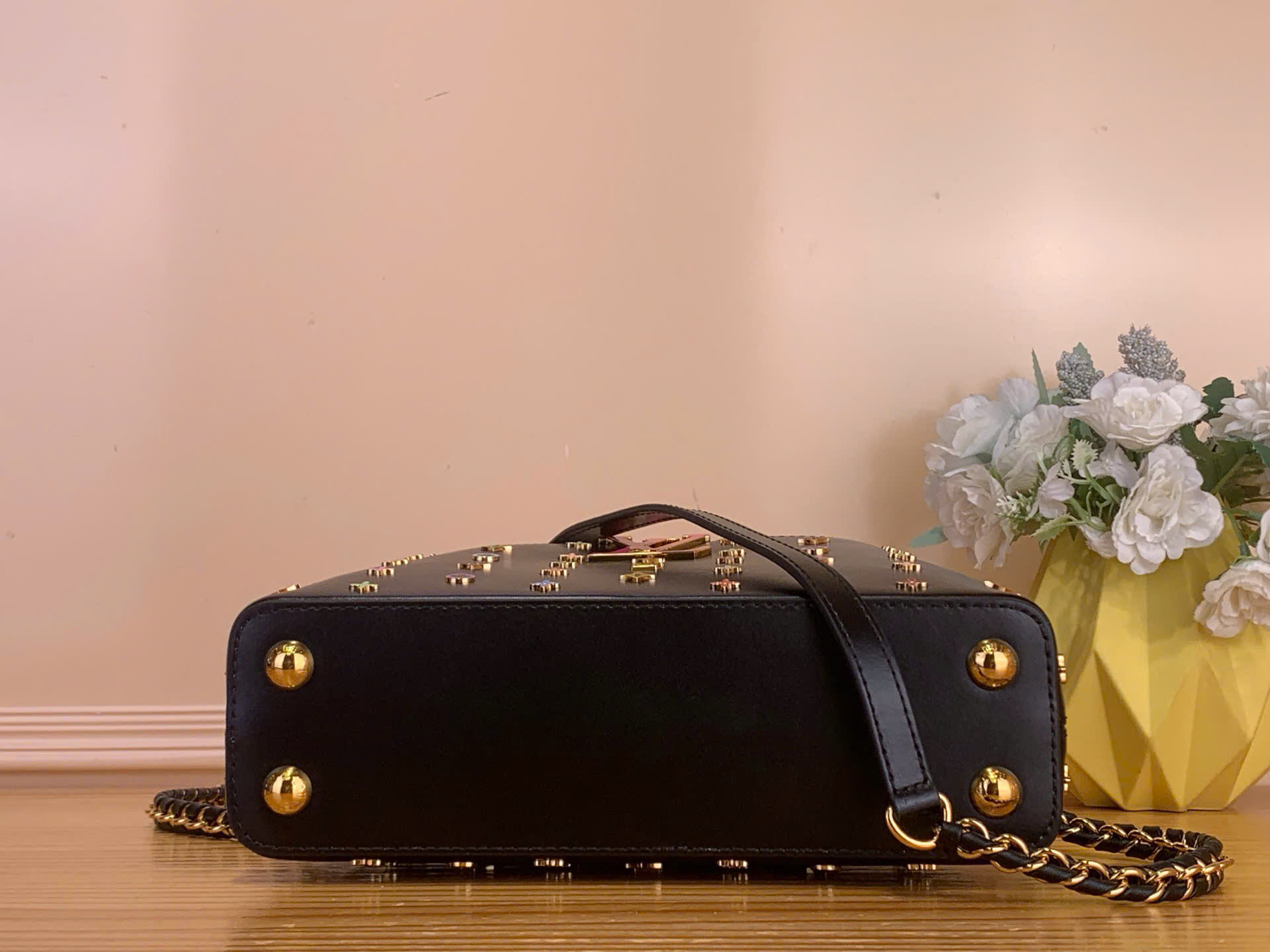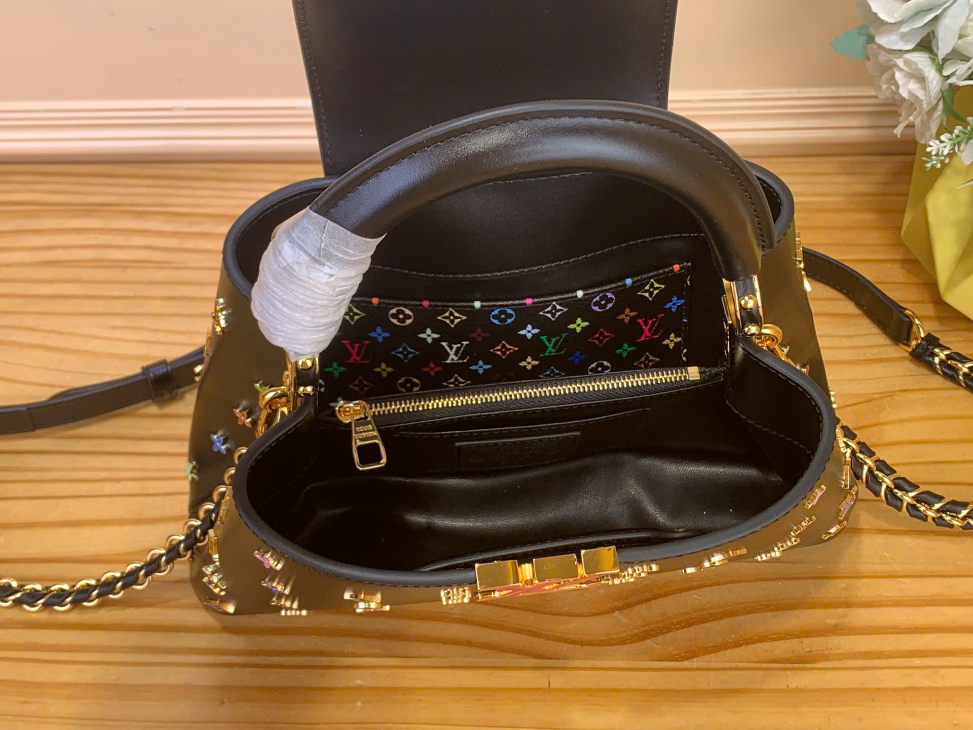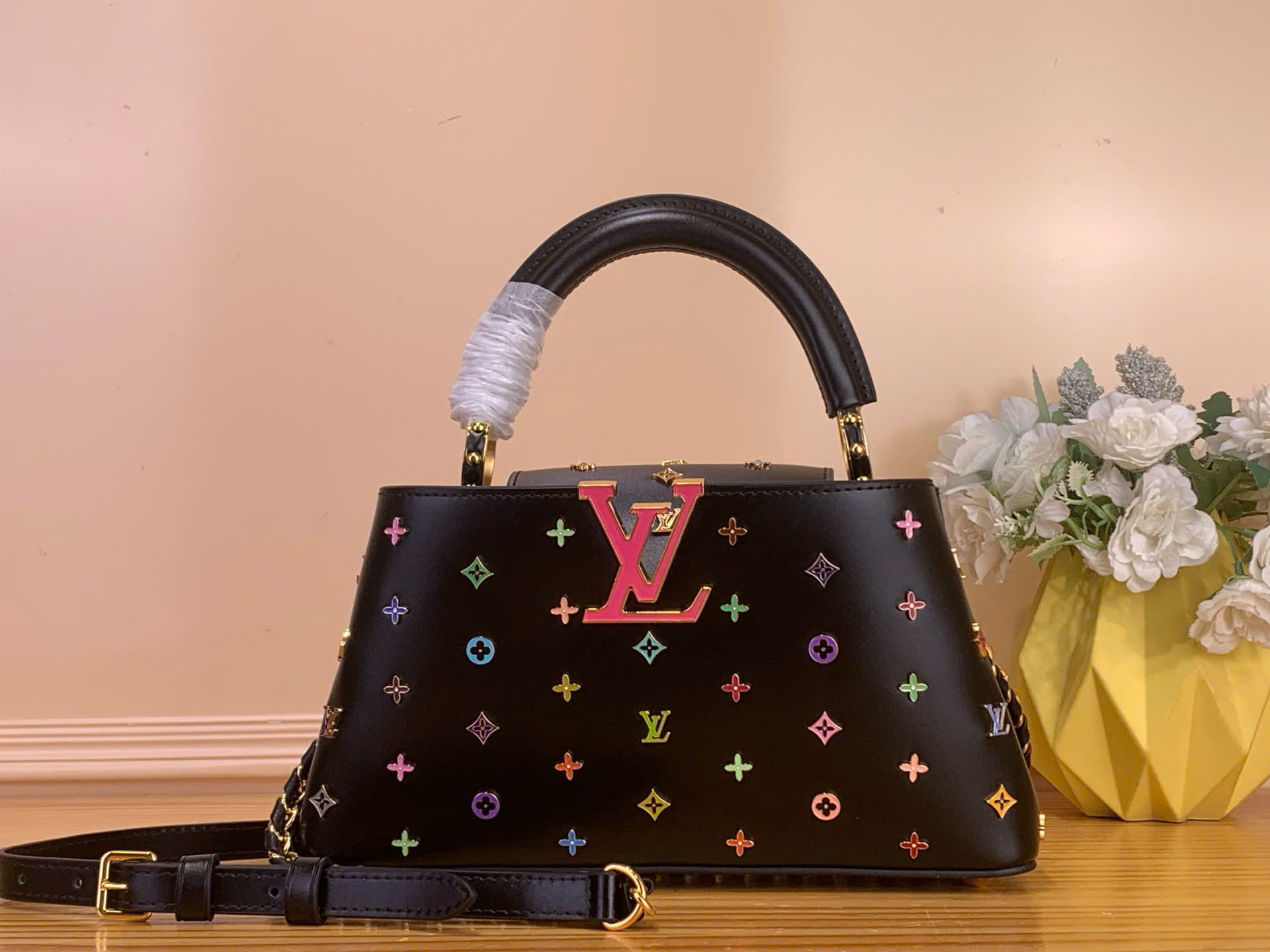 • Điểm nhấn hoa LV tráng men đa sắc nổi bật trên nền đen cá tính