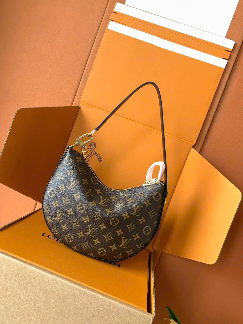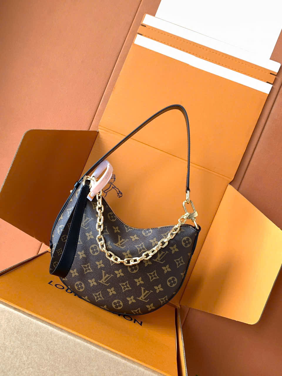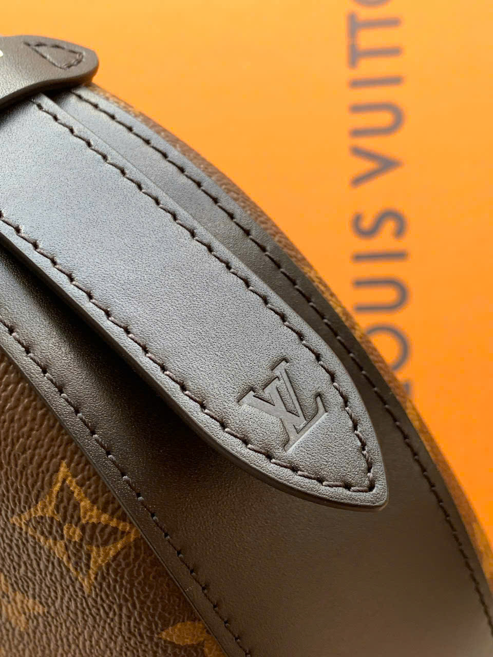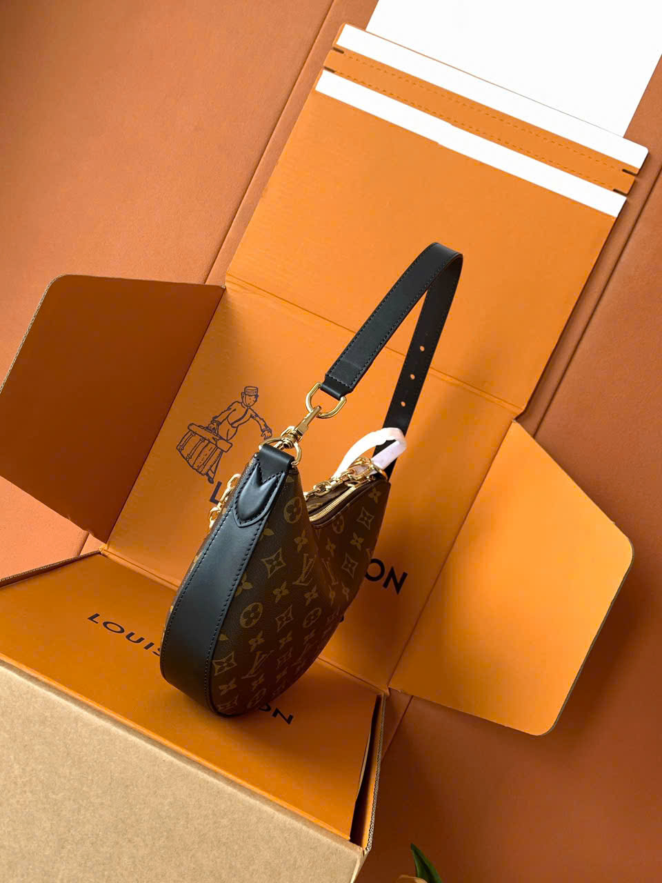 - Chất liệu: Chất liệu vải Monogram phủ bóng kết hợp viền da đối lập, tạo hình dáng nửa nguyệt độc đáo.