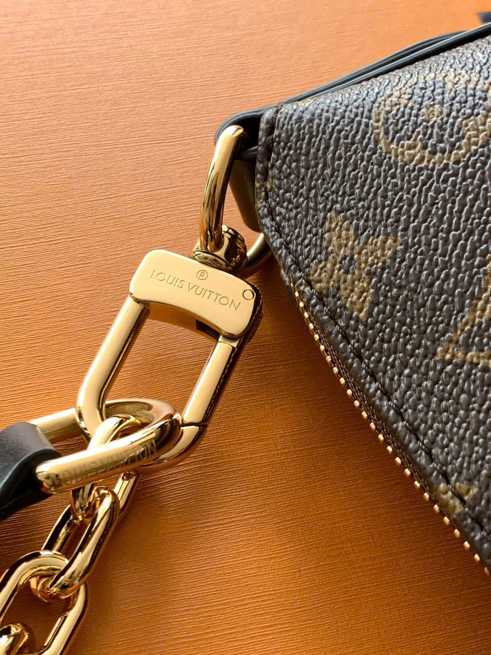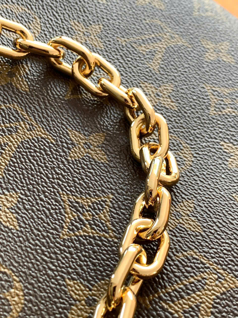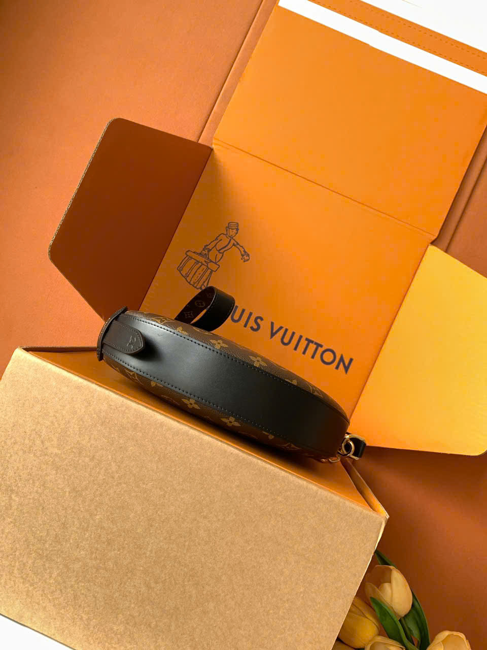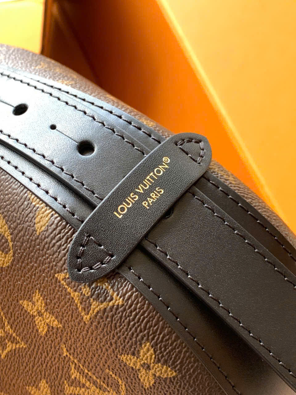 - Chất liệu: Chất liệu vải Monogram phủ bóng kết hợp viền da đối lập, tạo hình dáng nửa nguyệt độc đáo.