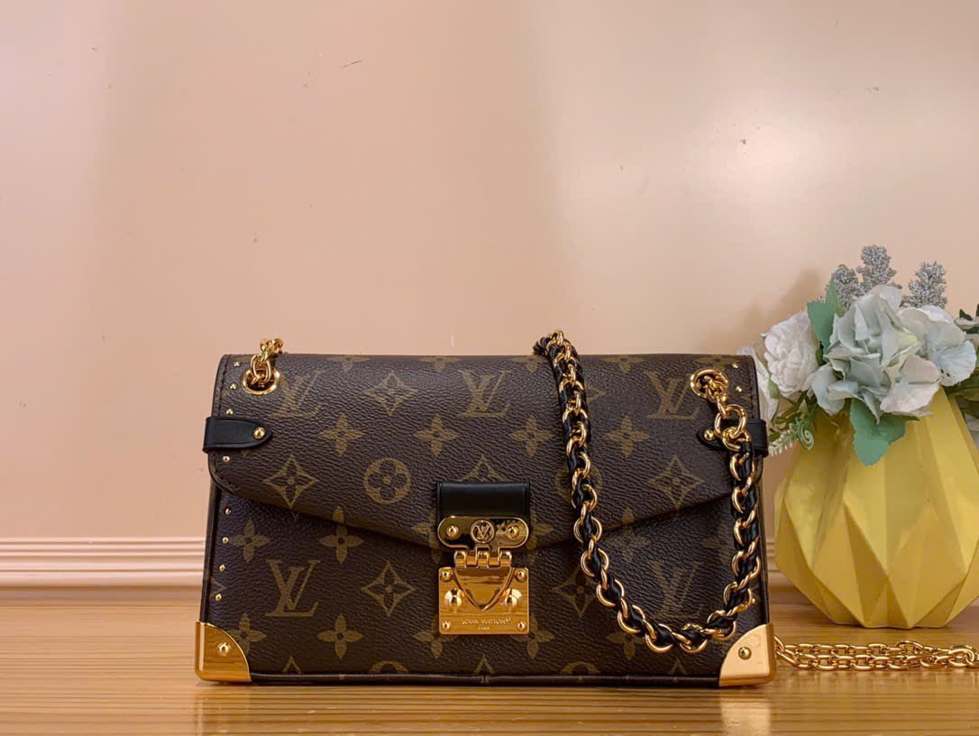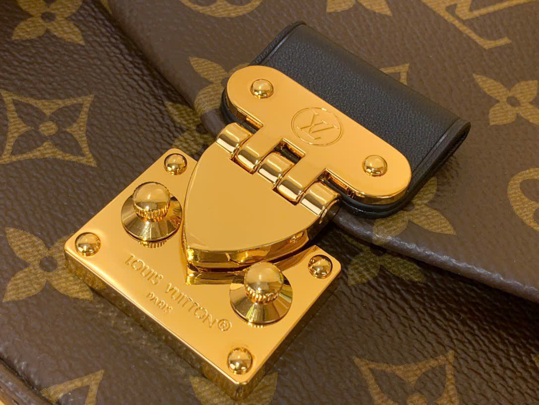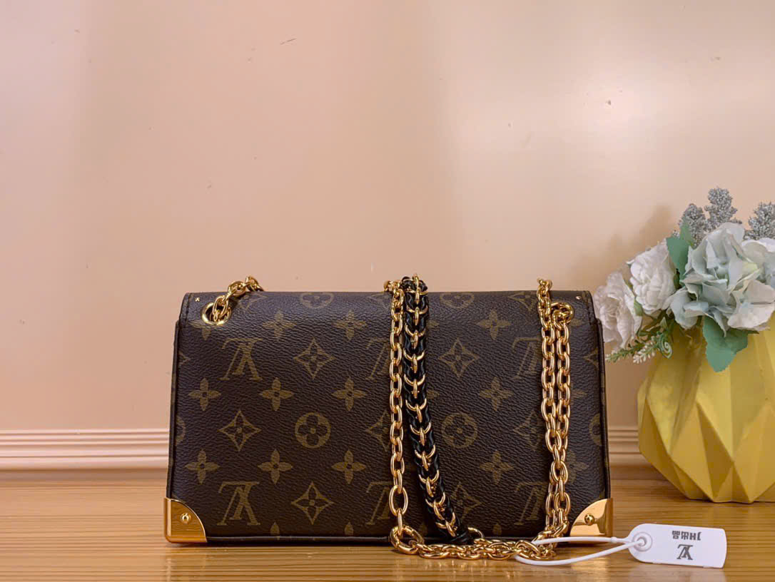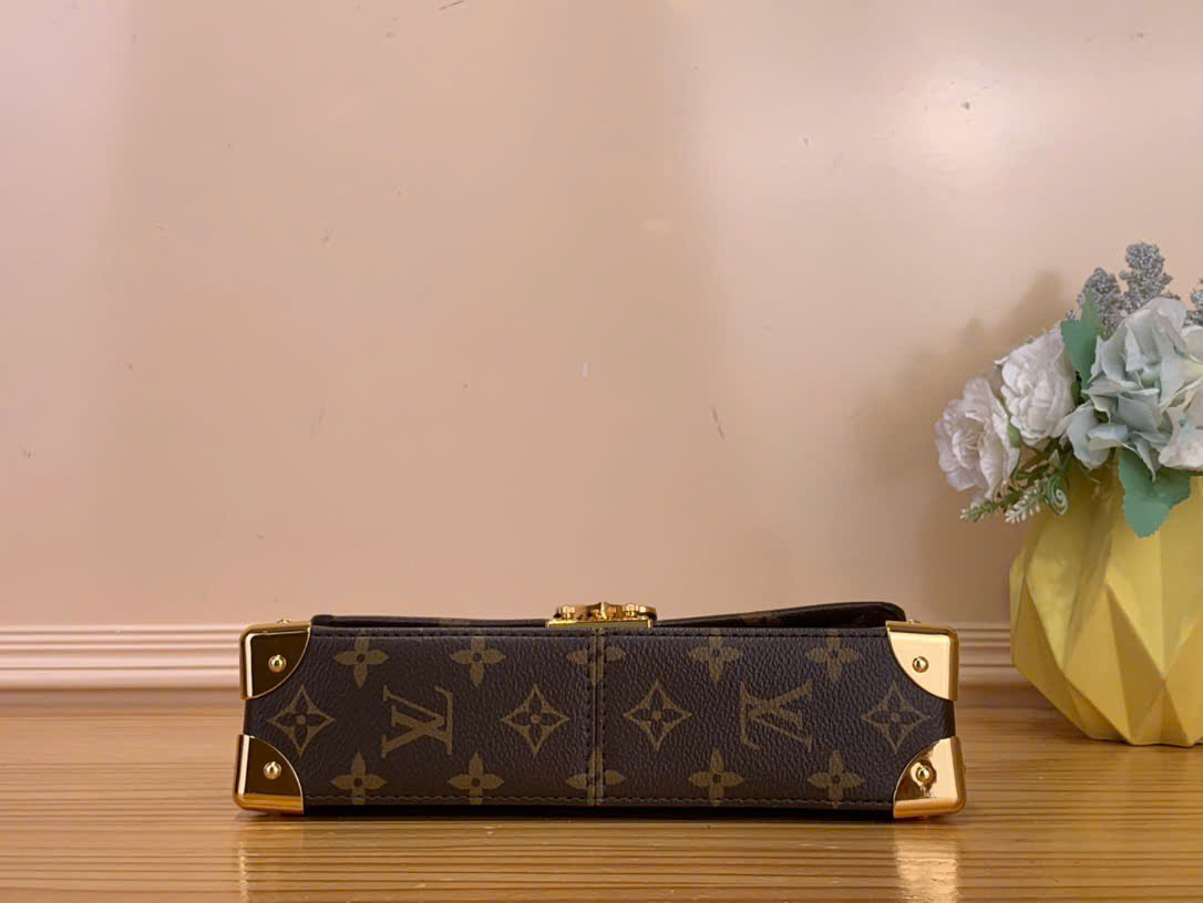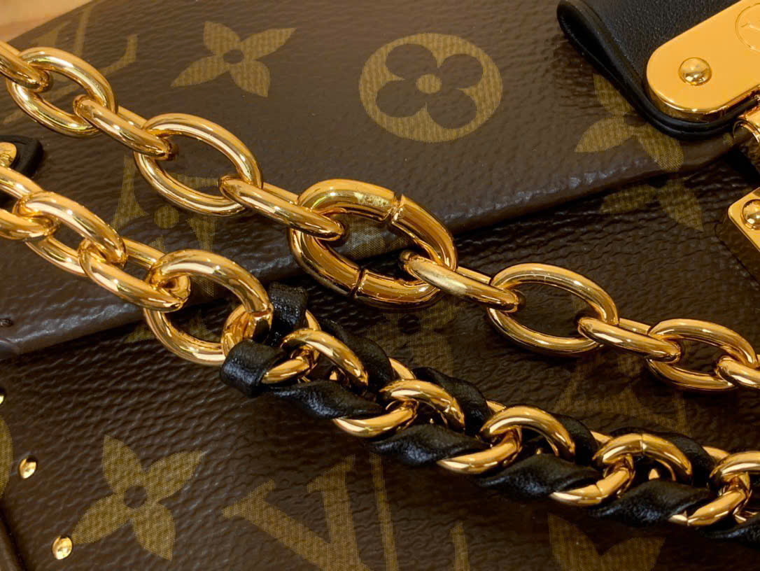 • Chất liệu canvas Monogram đặc trưng kết hợp khóa da, khóa S-lock, góc kim loại và đinh tán nổi bật, thể hiện di sản chế tác hành lý của thương hiệu.