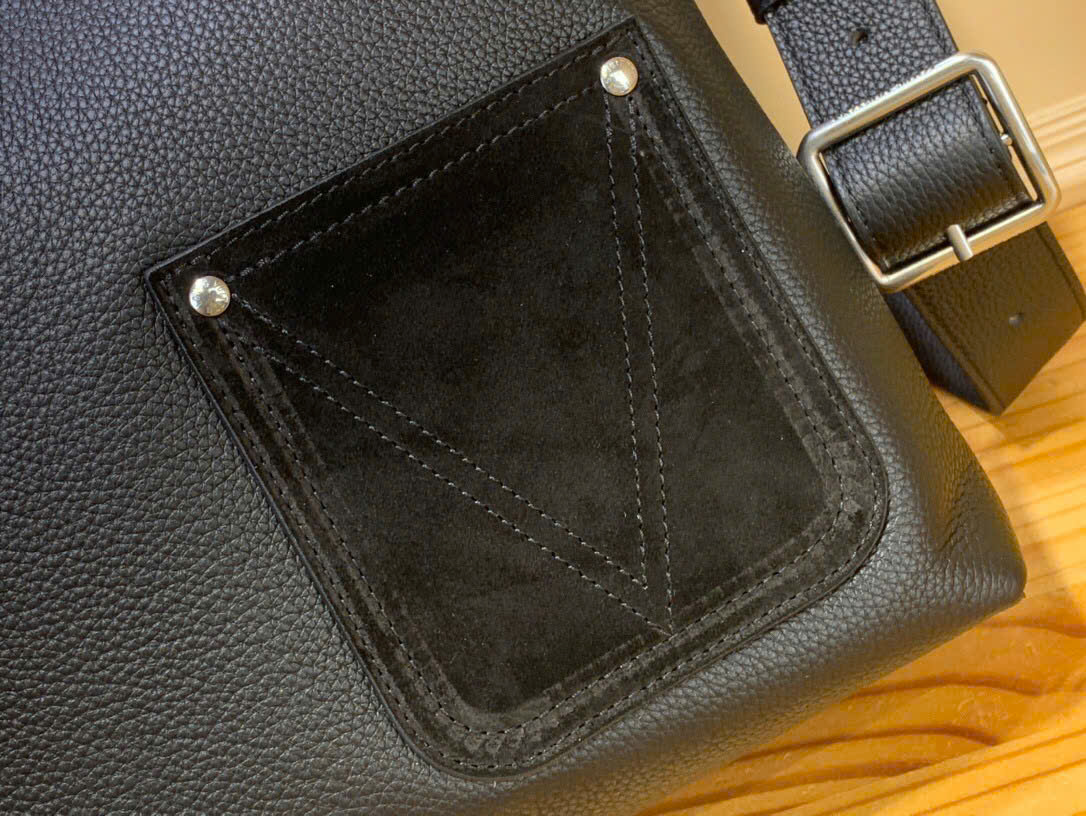 • Đường chỉ chữ V đặc trưng hai bên túi được hoàn thiện tinh xảo, tôn lên vẻ đẹp thủ công.