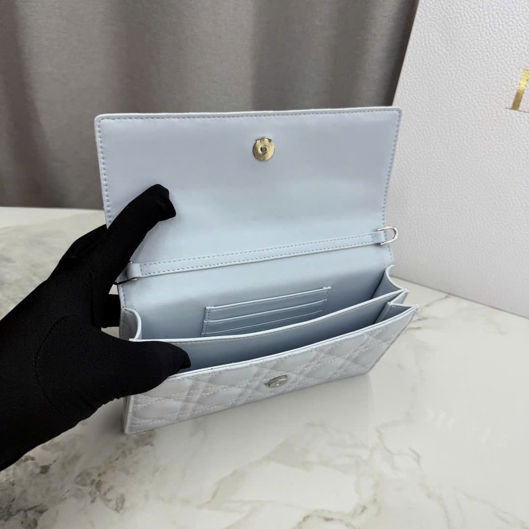 • Chất liệu da cừu (lambskin) cao cấp, mềm mịn, sang trọng. • Màu xanh băng (ice blue) phối khóa bạc, thanh lịch và rất dễ phối đồ. • Họa tiết cannage kinh điển, mang đậm phong cách Dior tinh tế. • Mặt trước trang trí nơ da + charm D.I.O.R kim loại, tạo điểm nhấn nữ tính. • Thiết kế mini chain bag, phù hợp đi tiệc, dạo phố hoặc sự kiện. • 2 ngăn chính + 3 khe thẻ + 1 ngăn sau, tiện sắp xếp đồ cá nhân. • Đựng vừa điện thoại, thẻ, son, vật dụng thiết yếu hằng ngày. • Tay cầm da gập + dây xích tháo rời, có thể xách tay hoặc đeo chéo linh hoạt. • Phiên bản siêu VIP, hoàn thiện tinh xảo, chuẩn form, kèm full hộp boutique. ????