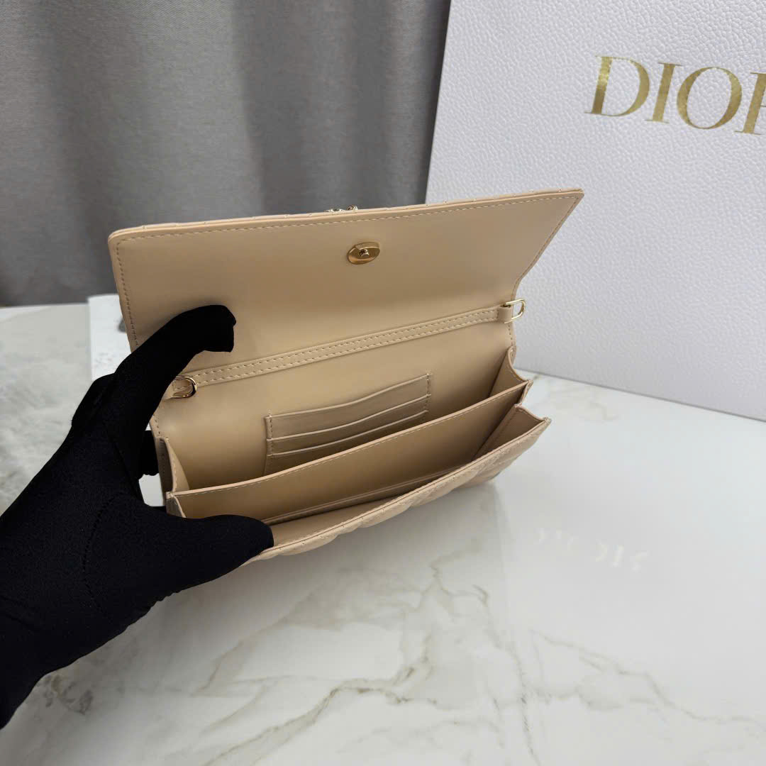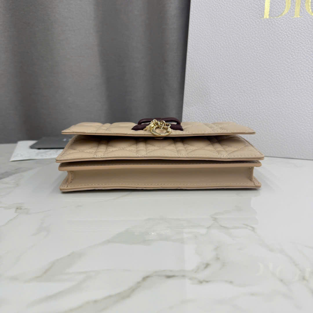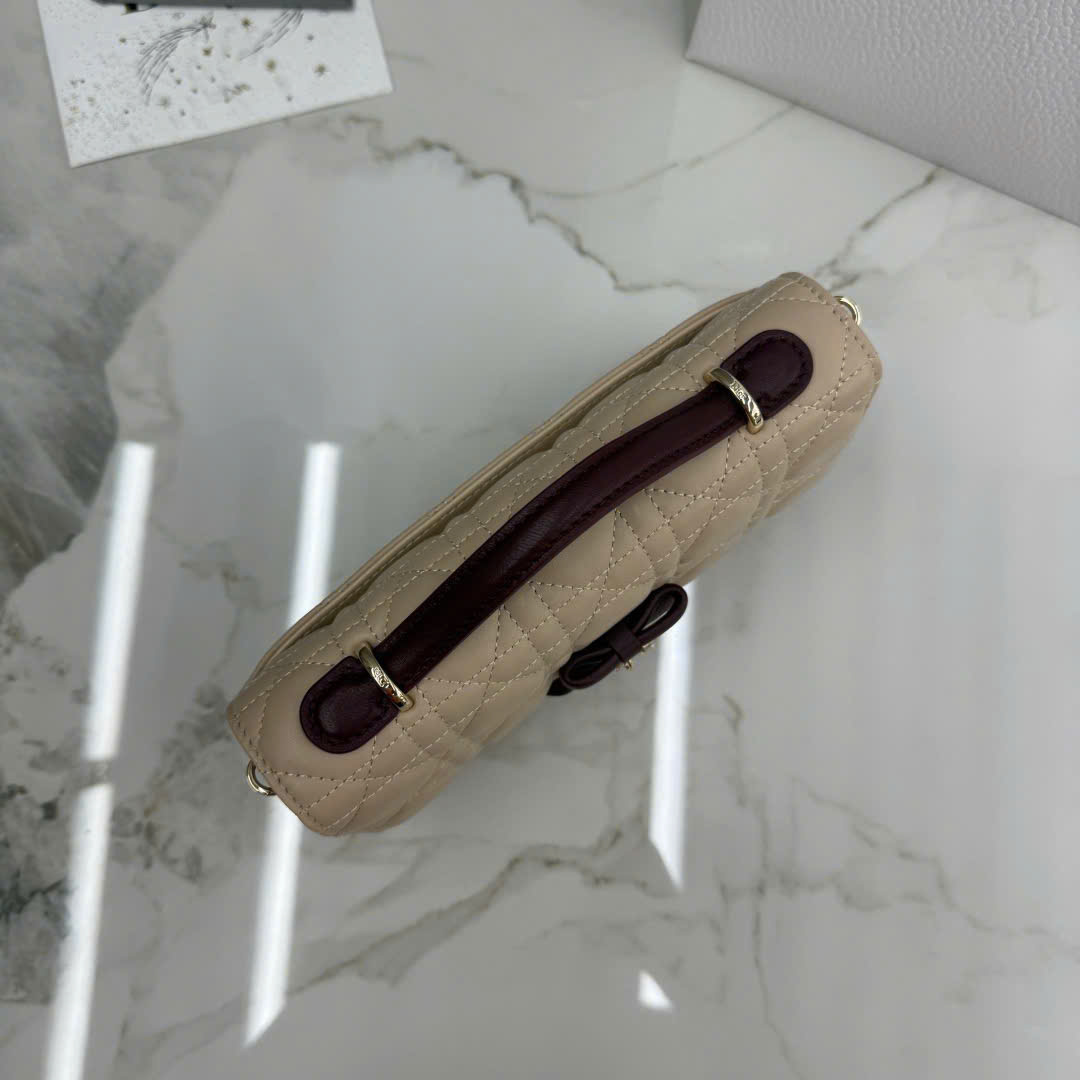 • Chất liệu da cừu (lambskin) cao cấp, mềm mịn, sang trọng. • Phối màu caramel – be – đỏ rượu, kết hợp khóa vàng nhạt nổi bật. • Họa tiết cannage (đan mây) kinh điển, đậm chất Dior thanh lịch. • Mặt trước trang trí nơ da + charm D.I.O.R, tạo điểm nhấn nữ tính. • Thiết kế mini chain bag, phù hợp đi tiệc, dạo phố hoặc sự kiện. • 2 ngăn chính + 3 khe thẻ + 1 ngăn sau, sắp xếp đồ gọn gàng. • Đựng vừa điện thoại, thẻ, son, vật dụng thiết yếu hàng ngày. • Tay cầm da gập + dây xích tháo rời, có thể xách tay hoặc đeo chéo linh hoạt. • Phiên bản siêu VIP, hoàn thiện tinh xảo, chuẩn form, kèm full hộp boutique.