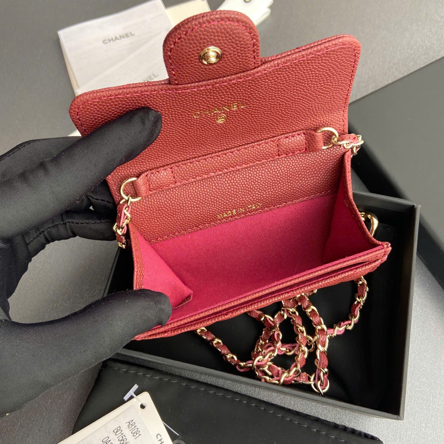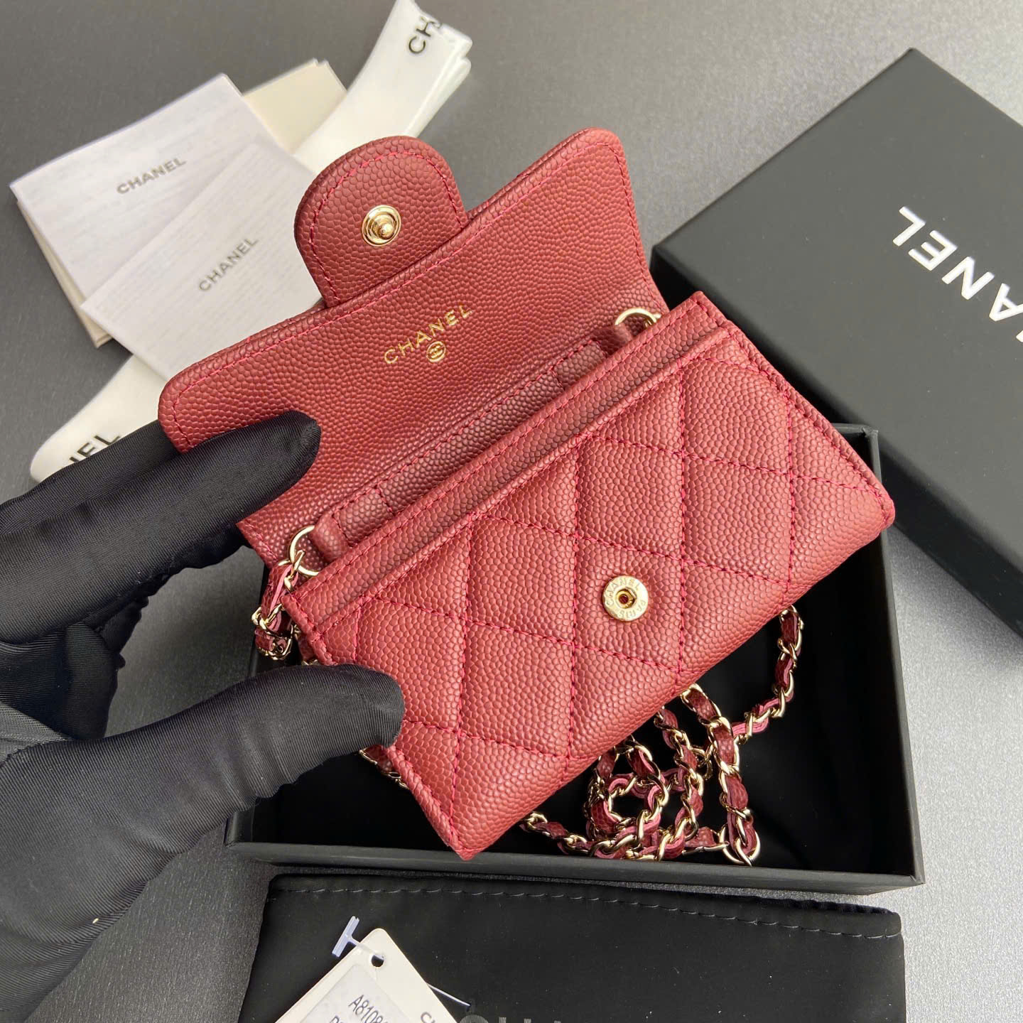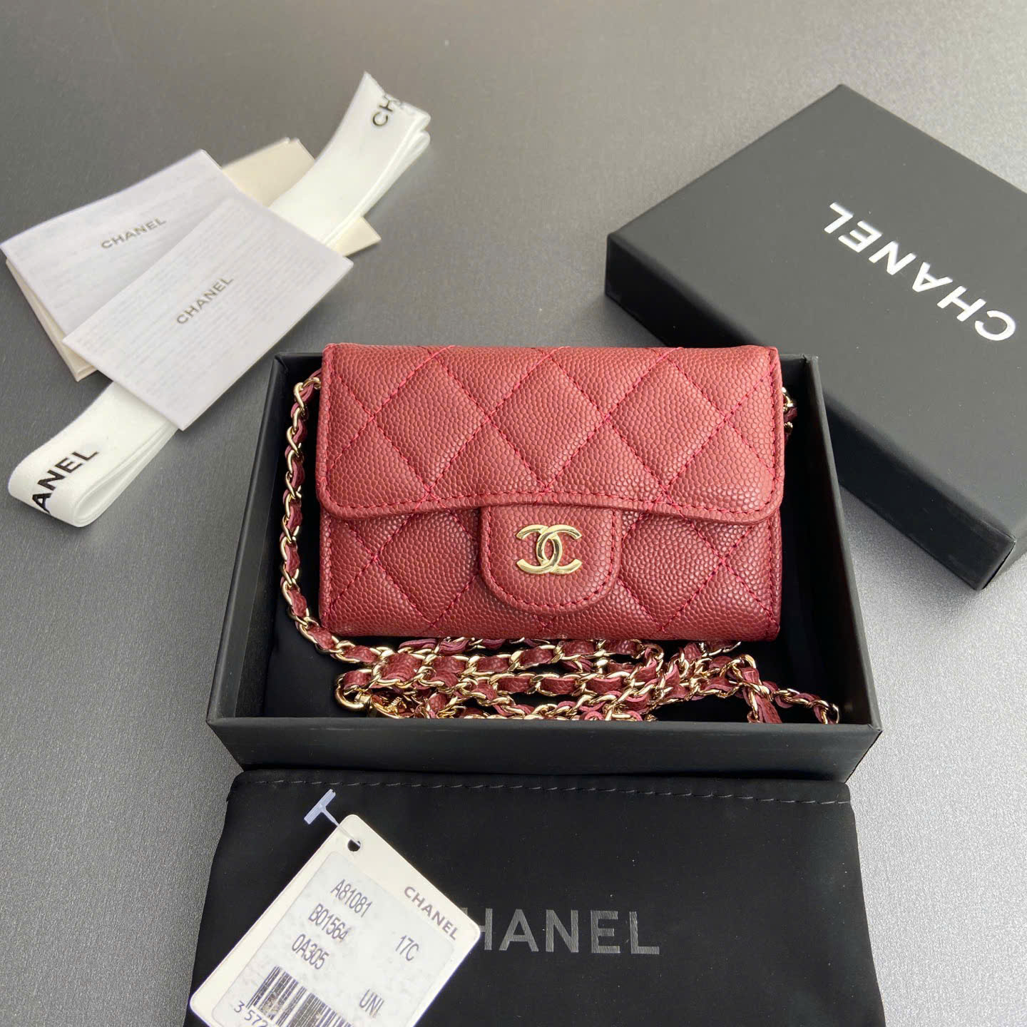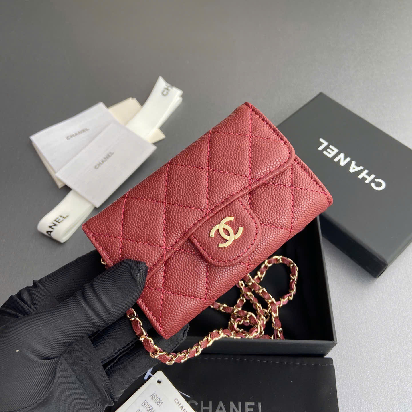 Ví Chanel Chain Card Holder A81081 Da Hạt Màu Đỏ Rượu Like Auth