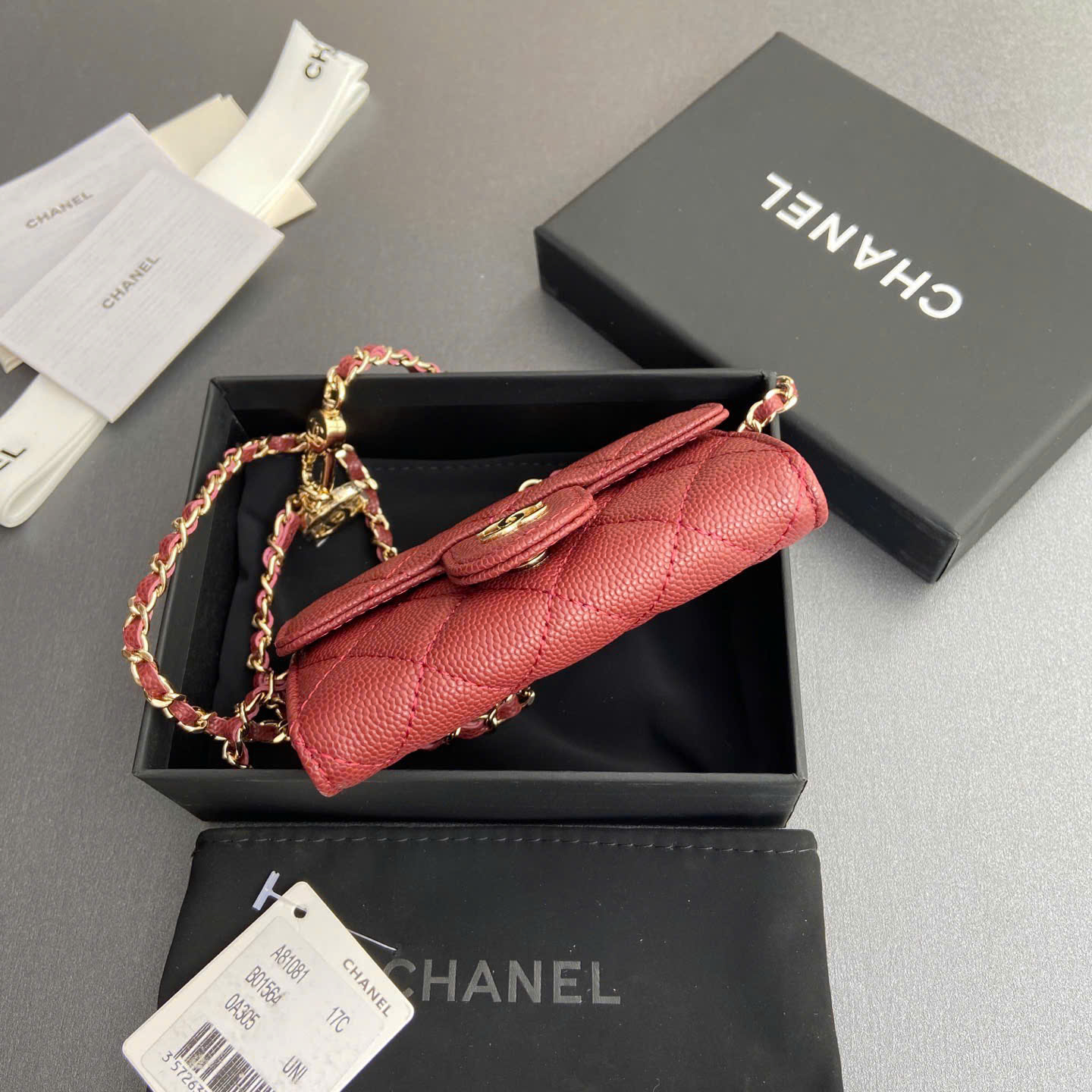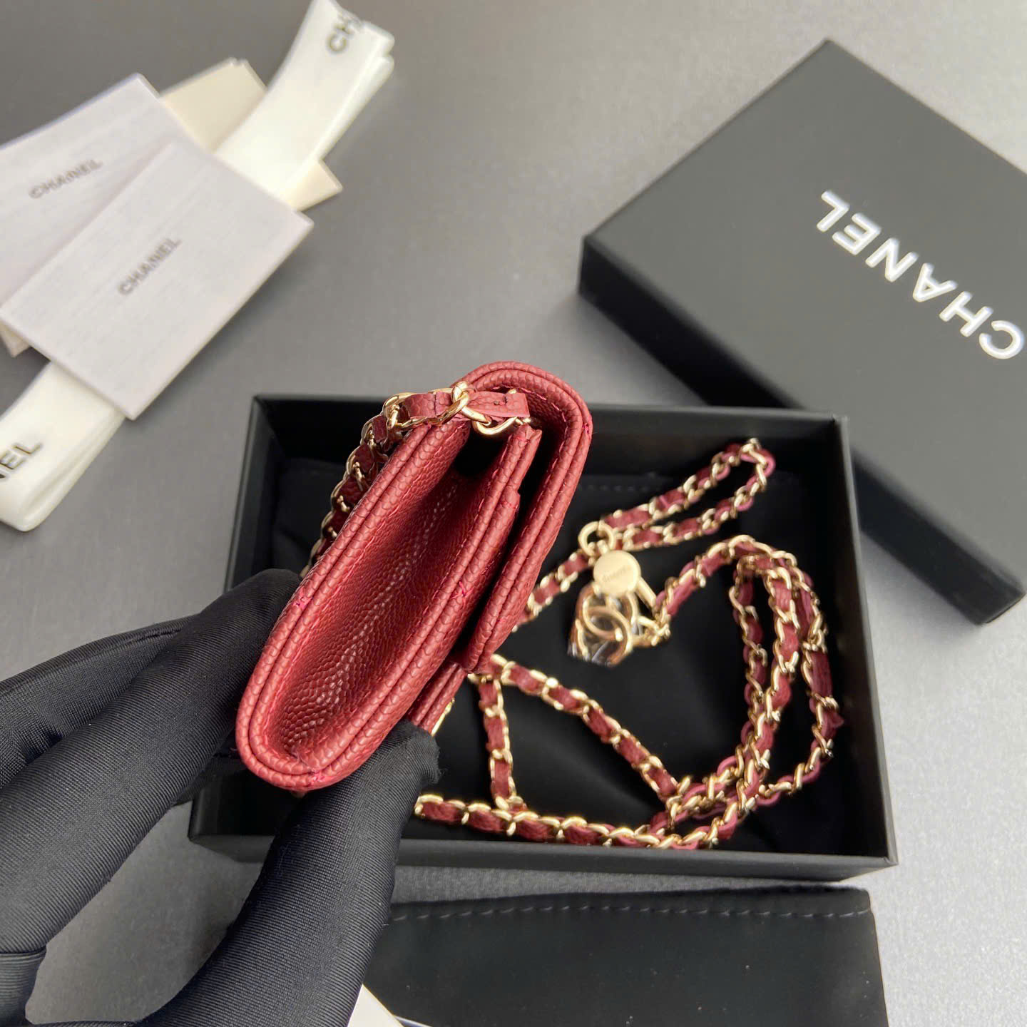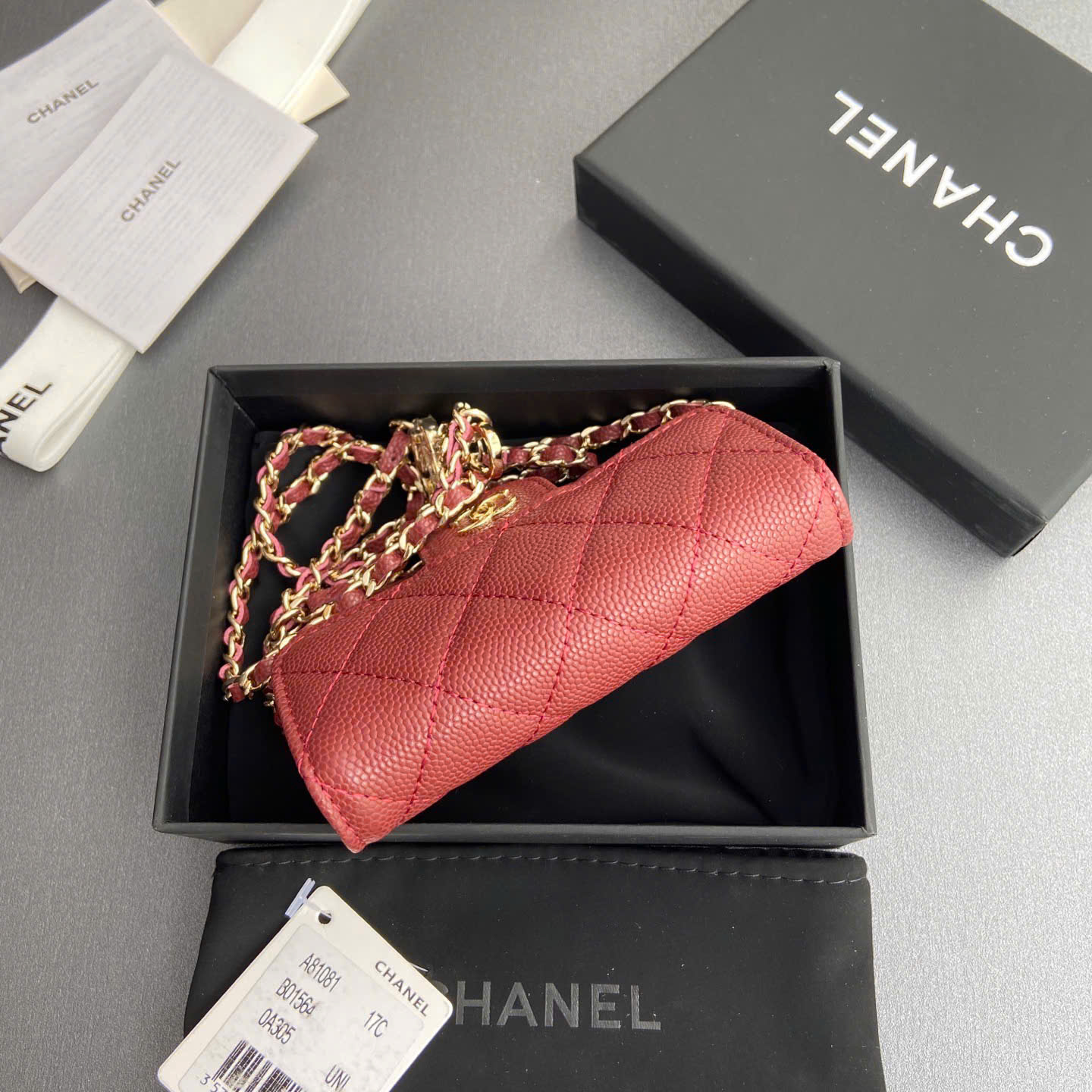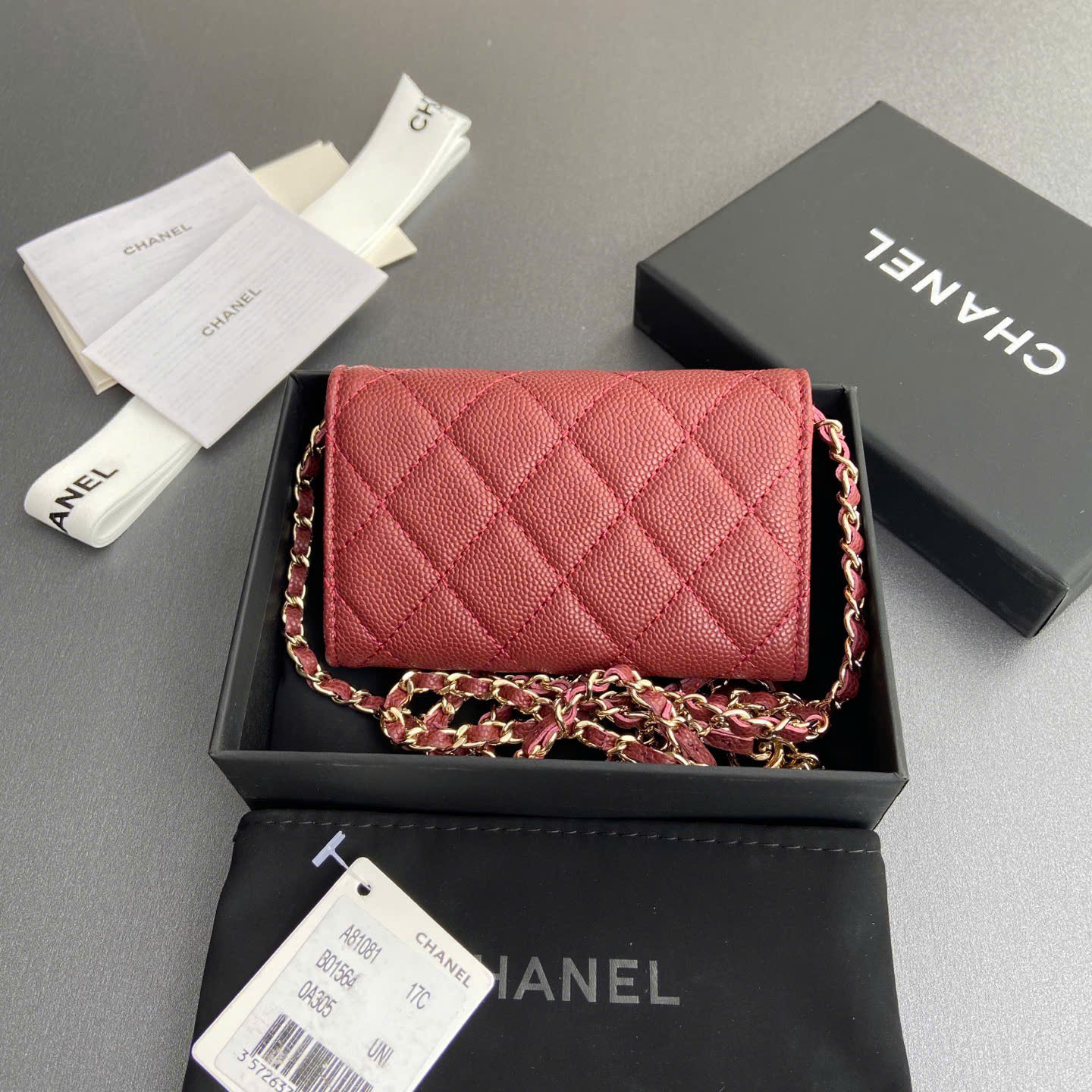 Ví Chanel Chain Card Holder A81081 Da Hạt Màu Đỏ Rượu Like Auth