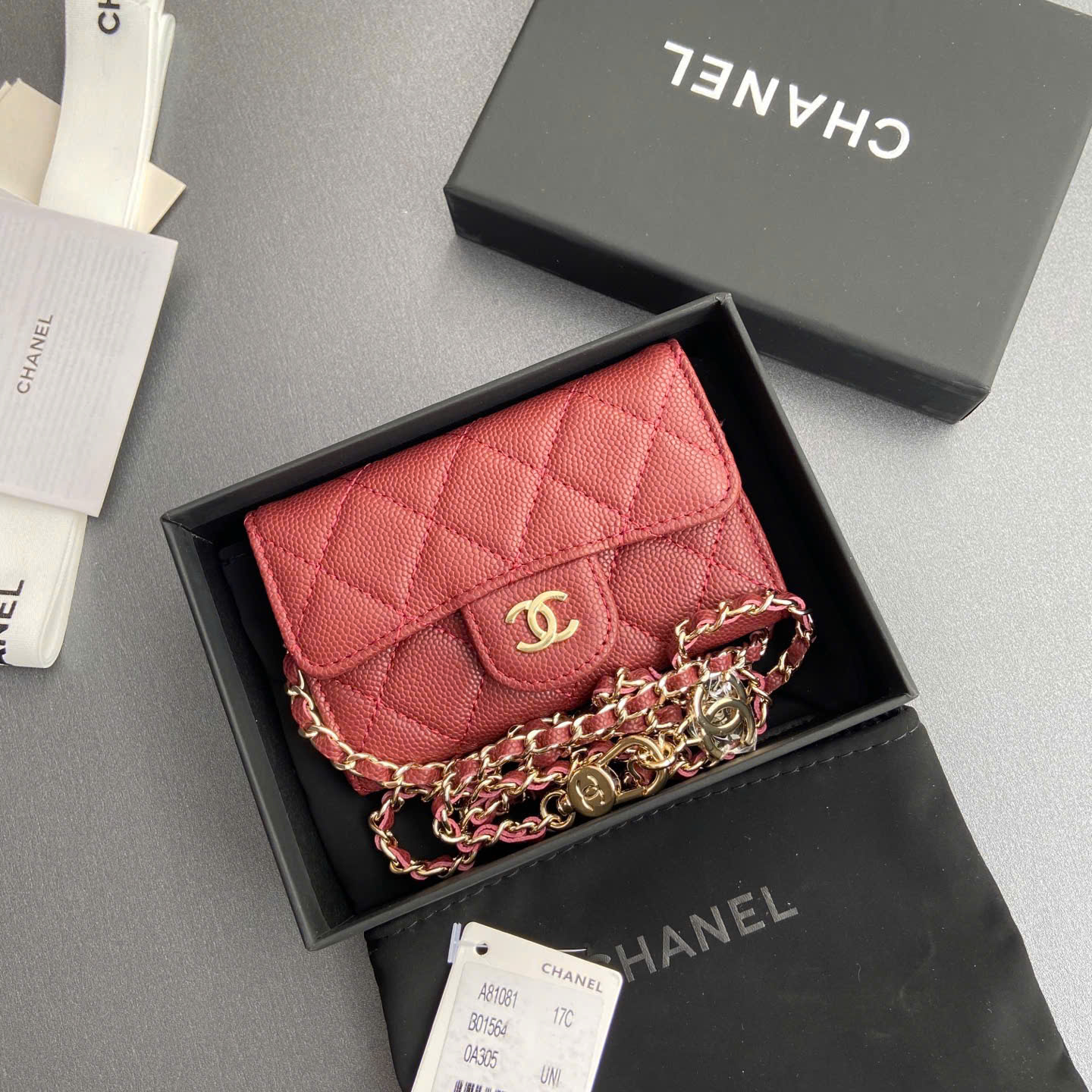 Kích thước: 11 x 7 cm (Dài x Cao) Tên sản phẩm: Ví Chanel Chain Card Holder A81081 Da Hạt Màu Đỏ Rượu Like Auth Mã sản phẩm: A81081 Mô tả sản phẩm: